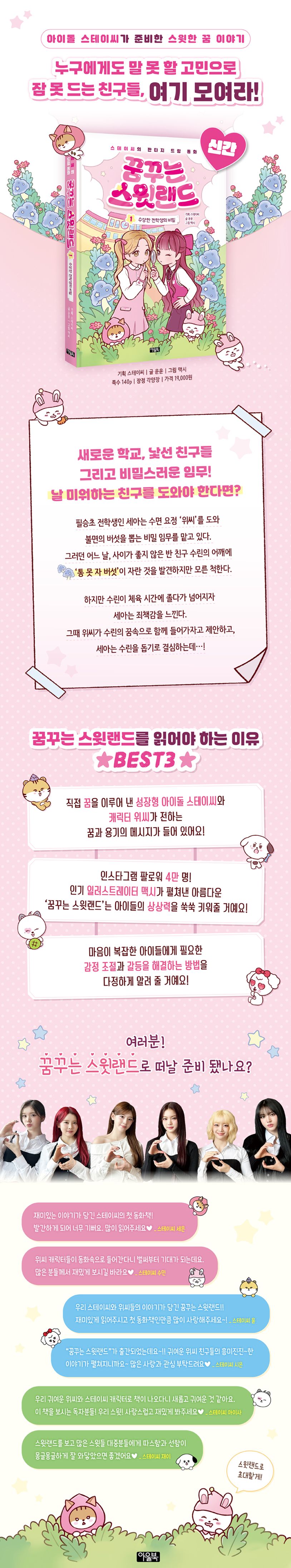 어린이들에게 희망과 용기를 전하는 특별한 동화책, 〈꿈꾸는 스윗랜드〉가 찾아왔다. 아이돌 스테이씨는 어린이 스윗(스테이씨 공식 팬덤명)에 대한 애정과 응원을 담뿍 담아 도서 개발에 참여했다. 스테이씨는 우정, 사랑, 꿈 등의 여러 가지 고민으로 잠들지 못하는 스윗들에게 들려주고 싶은 따뜻한 메시지를 준비했다. 특히 스테이씨가 직접 개발에 참여한 캐릭터 위씨들이 수면 요정으로 깜짝 변신했다. 위씨들은 스윗랜드를 지키기 위해 어린이들과 힘을 합친다. 스테이씨와 닮은 귀여운 여섯 명의 친구들과 함께하다 보면, 고민이 스르륵 풀리고 어느새 달콤한 잠이 찾아올 것이다.
