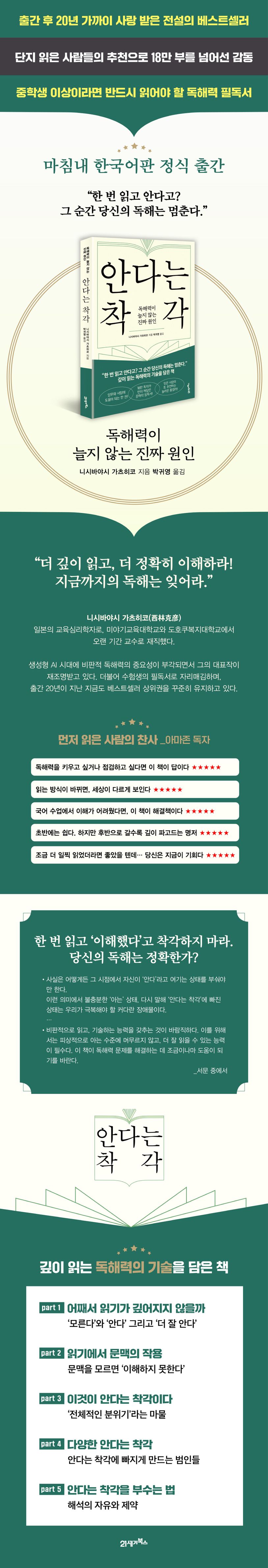 《안다는 착각》은 일본 아마존에서 입소문만으로 18만 부를 돌파한 책이다. 이 책은 그동안 분명 글을 읽고 난 뒤인데도 내용을 이해할 수 없었던 이유를 선명하게 밝혀 준다. 분명 읽고 내용을 안다고 생각했는데 질문에는 답할 수 없던 이유는, 정확히 모르는데 ‘알고 있다’고 ‘착각’했기 때문이다. 이 명확한 인과 관계를 그동안 우리는 모르는 척해 왔다.