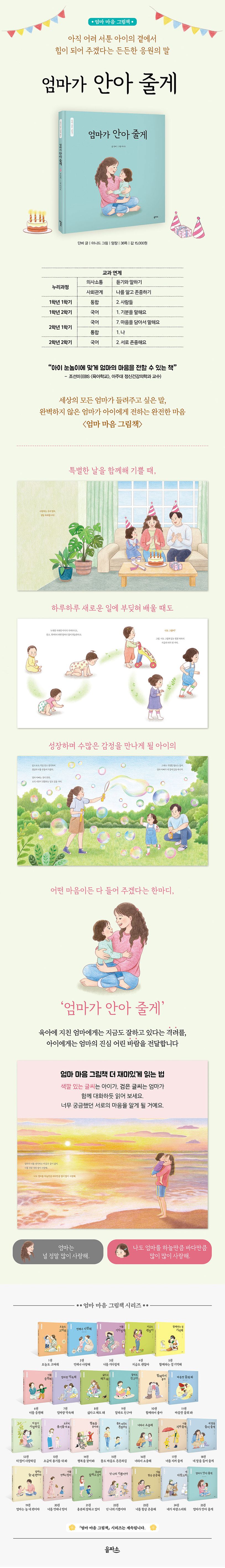 엄마가 아이에게 전하고 싶은 마음을 담은 《엄마 마음 그림책》 시리즈 스물다섯 번째 권 《엄마가 안아 줄게》가 출간되었습니다. 《엄마가 안아 줄게》는 성장하며 ‘나’라는 자아를 만들어 가는 동안 엄마와 나누고 싶은 아이의 모든 마음을 포근히 안아 주겠다는 엄마의 마음을 담았습니다.