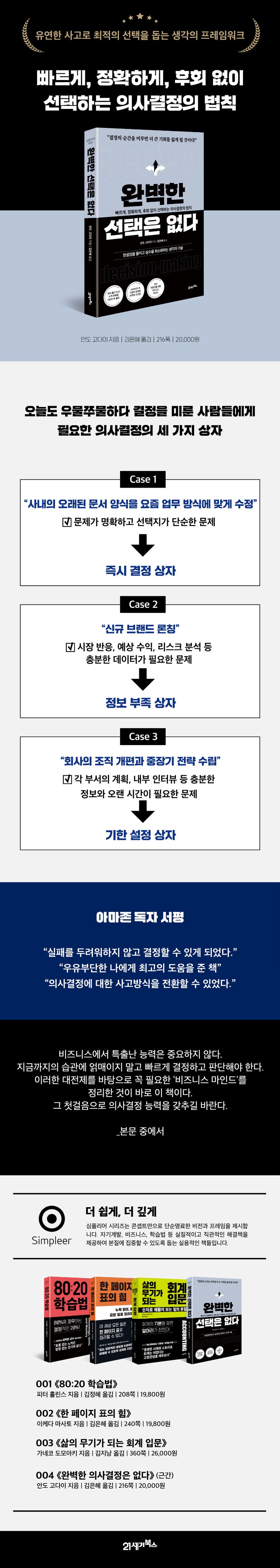 빠르게 흘러가는 현대사회, 우리는 매일 크고 작은 선택을 요구받는다. 수많은 선택지 앞에서 당신은 얼마나 빠르게 결단하고 선택하는가? 『완벽한 선택은 없다』의 저자 안도 고다이는 결정의 순간을 미루는 것은 더 큰 기회 손실을 초래할 뿐이라고 말하며, 신속하고 효과적인 의사결정이 삶과 비즈니스에서 얼마나 중요한지 강조한다. 선택의 기로에 놓인 우리를 구하는 것은 의사결정 기술이라는 것이다. 이 책은 ‘의사결정은 단단한 것’이라는 우리의 고정관념을 깨뜨리고, ‘물처럼 유연한 사고방식’을 통해 망설임을 줄이고 실수를 최소화하는 선택을 할 수 있도록 도울 것이다.