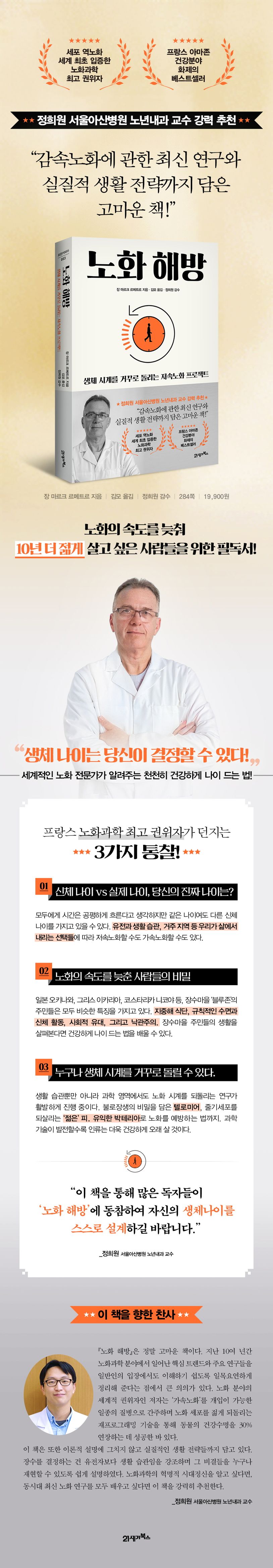 세포 역노화 과정을 세계 최초로 입증한 노화과학 최고 권위자 장 마르크 르메트르의 책이 21세기북스에서 출간되었다. 이 책은 노화의 메커니즘을 분석하여 건강하게 나이 드는 법을 다방면으로 제시한다. 최신 연구가 입증한 노화에 관한 새로운 사실들과 장수마을 주민들의 공통적인 특징을 통해 찾아낸 장수의 비밀, 그리고 노화의 속도를 늦추는 구체적인 생활 습관까지, 천천히 건강하게 늙고 싶어 하는 사람들이 알아야 할 모든 것을 담아냈다. 추천사를 쓴 정희원 서울아산병원 노년내과 교수는 이 책에 대해 “감속노화에 관한 최신 연구와 실질적 생활 전략까지 담은 고마운 책”이라고 표현하기도 했다. 저자는 불로장생의 꿈은 더 이상 허무맹랑한 소리가 아니라고 주장하며, 노화 연구가 지금 어디까지 진행되고 있는지 생생하게 보여준다. 불로장생은 더 이상 미친 과학자의 꿈이 아니다. 노화의 원인을 분명하게 파악한다면, 노화의 시곗바늘이 너무 빠르게 움직이지 않도록 또는 속도를 늦추거나 심지어 바늘의 방향을 거꾸로 돌리는 것도 얼마든지 가능하다고 저자는 말한다.
