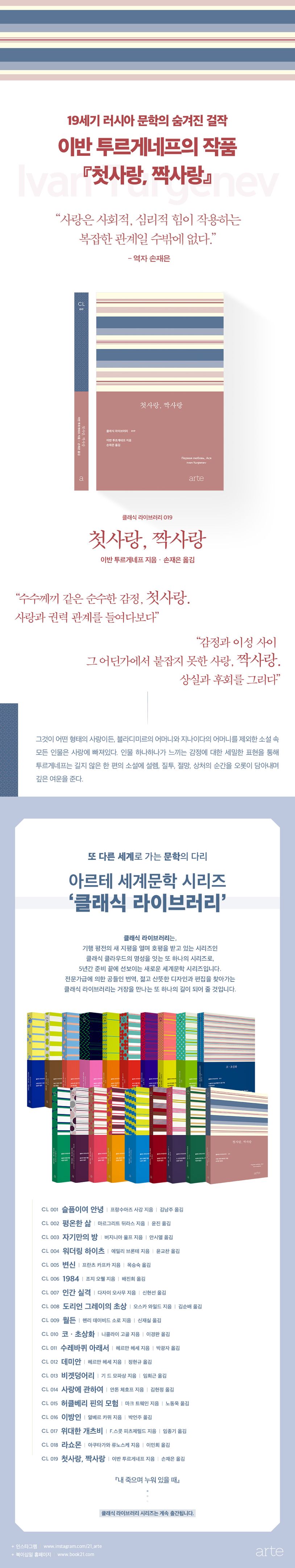 또 다른 세계로 가는 문학의 다리, 아르테 세계문학 시리즈 열아홉 번째 작품 『첫사랑, 짝사랑』 이 발간되었다. 톨스토이, 도스토옙스키와 함께 러시아 3대 문호 중 한 명인 이반 투르게네프(Ivan Turgenev)의 작품을 선보인다. 우리에게는 조금 낯선 작가인 이반 투르게네프는 서구 독자들에게 처음으로 널리 알려진 러시아 작가였다. 그는 프랑스, 독일, 영국 등 유럽 여러 나라에서 활동하며, 러시아 문학의 독창성과 깊이를 세계 널리 알렸다. 투르게네프가 유럽 여러 나라에서 활동하게 된 데는 한 가지 비밀이 있다. 1843년 스물다섯 살이었던 투르게네프는 한 오페라 무대에서 천상의 목소리를 가진 여성을 만나게 된다. 그녀는 유럽 무대의 스타였던 프랑스 오페라 가수 폴린 비아르도(P. Viardot)다. 그녀가 노래하는 것을 본 순간 투르게네프는 사랑에 빠져 버렸지만, 그녀는 이미 결혼해 자식까지 둔 유부녀였다. 투르게네프는 평생 결혼하지 않았으며 그의 짝사랑은 그가 숨을 거둘 때까지 사십 년 동안 이어졌다. 『첫사랑, 짝사랑』 은 이반 투르게네프가 마치 글로 쓴 자화상 같다.