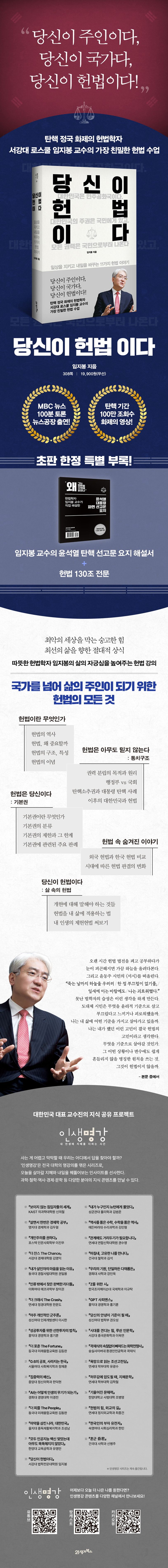 『당신이 헌법이다』는 탄핵 정국 화제의 헌법학자 임지봉 교수가 어떤 상황에서도 결코 흔들리지 않을 명징한 원칙으로서의 헌법을, 그 유래부터 삶을 위한 활용법까지 친절하게 담아낸 헌법 교양서다. 저자는 헌법을 둘러싼 최소한의 지식을 전할 뿐 아니라, 실제 한 명 한 명 시민의 삶 속에서 헌법이 어떻게 작동하고 있는지, 삶에 의미를 더하고 자긍심을 높여줄 헌법 사용법은 무엇인지 상세히 설명한다. 이 책을 통해 헌법의 원천으로서 ‘우리와 나의 가치’를 재발견하고, 헌법에 기반한 자기 삶의 철학과 품격 있는 삶의 태도도 함양할 수 있을 것이다.