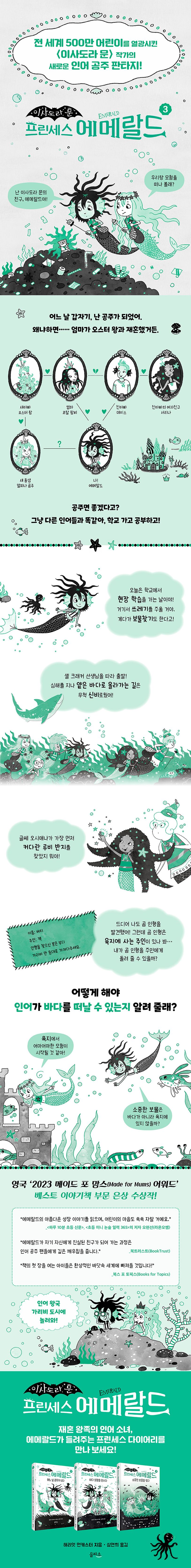 반짝이는보석,예쁜머리핀,멋진장난감…어쩌면보물은누군가의슬픔에공감하는마음이아닐까?진짜소중한보물을찾아떠나는인어공주의모험인어왕국가리비도시에사는평범한인어소녀에메랄드는어느날갑자기공주가되었습니다.엄마가오스터왕과재혼했기때문이지요.1년중반은궁전에서생활하고나머지반은아빠와지낸답니다.오늘은학교에서현장학습가는날이에요.신비한심해를지나얕은바다에올라가인간들이버린쓰레기를주워요.게다가바다보물찾기도할수있는데보물찾기로찾은물건중에서맘에드는물건하나를골라간직할수있대요.셸크래커선생님은반아이들에게안전조끼와그물주머니,바다창을나누어주고,주의사항을말해주었어요.에메랄드와친구들은모두바다창으로모랫바닥에박힌알록달록한쓰레기를주우며보물이있나두리번거렸답니다.오시애나는커다란루비반지를주웠고,마리나도예쁜무지개모양머리핀을찾았어요!에메랄드만빈손이었지요…….드디어에메랄드도보석같이반짝반짝빛나는해초더미에서무언가를발견했답니다!바로곰인형이었지요.에메랄드는곰인형의주인을찾아주겠다고결심해요.그런데바다에사는인어가어떻게육지에사는인간을찾죠?인어의꼬리는물속에서만움직일수있잖아요!곰인형을잃어버린주인의마음에공감하는에메랄드가찾은소중한보물은무엇일까요?아주특별하고조금별난인어공주의육지탐험이지금시작됩니다!전세계500만어린이를열광시킨〈이사도라문〉작가의변함없는메시지“그저너답게하면돼.그걸로충분하단다.”〈프린세스에메랄드〉는뱀파이어요정〈이사도라문〉과〈마녀요정미라벨〉시리즈로전세계41개국500만어린이를판타지세계로이끈작가,해리엇먼캐스터가선보이는인어공주시리즈입니다.그런데에메랄드는그동안여러매체에서봐왔던인어공주와는완전히다릅니다.남들과다른초록색피부에,삐죽빼죽하게뻗친머리카락,심드렁한표정까지……‘공주’하면떠올리는일반적인이미지와는거리가멀지요.에메랄드는엄밀히말하면왕족혈통이아니니까요.평범한소녀의갑작스러운공주생활다이어리는결국나답게행동하면충분하다는소중한메시지를담고있습니다.더불어인종과외모가달라도열린마음으로수용하는자세,그리고재혼가정을향한따뜻한시선도가르쳐줍니다.전세계에서종교?인종?정치등여러가지이슈로갈등이심해지는오늘날,우리아이들에게가장필요한것은다양성을받아들이는열린마음이아닐까요? 에메랄드의따뜻한바닷속세상을경험하며,아이들은스스로와다른사람들을존중하는마음을배울것입니다.신비로운초록색과검은색으로꾸려진에메랄드세상에메랄드의세상은신비로운초록색과검은색으로만그려졌습니다.단두가지색을사용해캐릭터의두가지정체성을표현하는독특한설정은해리엇먼캐스터작가의특장점으로,이미해외각종매체에서도찬사를받은바있습니다.전작에서이사도라문의세상은귀여운분홍색과검은색으로,미라벨의세상은활기찬보라색과검은색으로구성되었지요.〈프린세스에메랄드〉의상징은초록빛과파란빛의중간쯤되는‘에메랄드색’입니다.에메랄드색은바닷속인어왕국의아름답고신비로운분위기를자아내독자들의시선을사로잡지요.뿐만아니라주인공이름도‘에메랄드’라는것을고려할때,에메랄드색설정은보통의소녀이면서공주이기도한사춘기소녀의정체성혼란을시각적으로보여주는장치라는것을알수있습니다.에메랄드빛인어왕국으로지금바로놀러오세요!에메랄드보석만큼이나아름다운이야기가펼쳐질것입니다.영국‘2023메이드포맘스(MadeforMums)어워드’베스트이야기책부문은상수상작!“에메랄드의아름다운성장이야기를읽으며,어린이의마음도쑥쑥자랄거예요.”_<하루10분초등신문>,<초등미니논술일력365>의저자오현선(라온오쌤)“에메랄드가자기자신에게진실된친구가되어가는과정은인어공주팬들에게깊은깨우침을줍니다.”_북트러스트(BookTrust)“책의첫장을여는아이들은환상적인바닷속세계에빠져들것입니다!”_북스포토픽스(BooksforTopics)*인증유형:공급자적합성확인