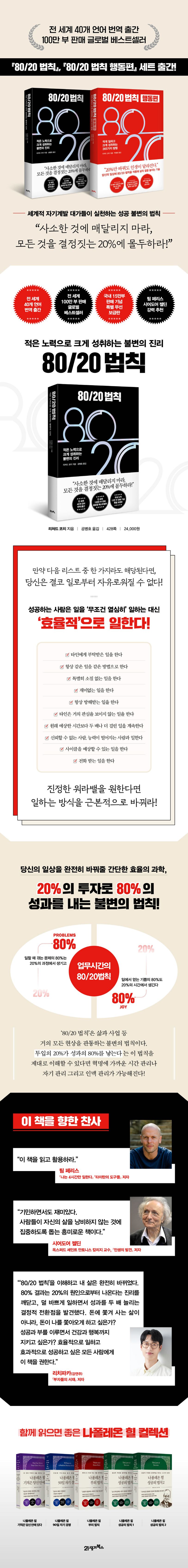 『80/20 법칙』은 전 세계 40개 언어로 번역되어 100만 부 이상 판매되며, 지금도 여전히 막강한 영향력을 발휘하고 있다. ‘80/20 법칙’은 삶과 사업 등 거의 모든 현상을 관통하는 불변의 법칙이다. 투입의 20%가 성과의 80%를 낳는다는 이 법칙을 제대로 이해할 수 있다면 혁명에 가까운 시간 관리나 자기 관리 그리고 인맥 관리가 가능해진다. 개인은 더 행복하고 효과적으로 살아갈 수 있으며, 영리를 추구하는 기업은 훨씬 더 많은 이윤을 얻을 수 있다. 이 법칙은 모든 개인과 조직이 더 적은 노력과 비용, 투자를 들여 더욱 가치 있는 결과를 얻도록 해준다.