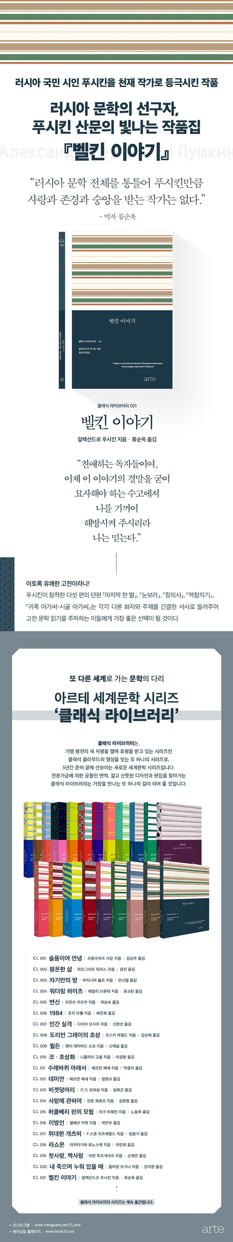 또 다른 세계로 가는 문학의 다리, 아르테 세계문학 시리즈 스물한 번째 작품 『벨킨 이야기』 가 발간되었다. 러시아 국민 시인 푸시킨을 천재 작가로 등극시킨 첫 산문 작품집 『벨킨 이야기』를 소개한다. 이 작품은 러시아 문학의 기틀을 다진 고전으로 불린다. 작가 푸시킨은 ‘벨킨’을 내세워 다섯 편의 단편 「마지막 한 발」, 「눈보라」, 「장의사」, 「역참지기」, 「귀족 아가씨-시골 아가씨」 를 들려준다. ‘벨킨’이 실존 인물인지, 허구인지 궁금증을 일으키며 진지하지만 유쾌한 패러디 문학의 길로 독자를 초대한다. 러시아 문학 전체를 통틀어 푸시킨만큼 사랑과존경과 숭앙을 받는 작가는 없다. 『클래식라이브러리021 벨킨 이야기』에 숨겨진 반전과 아이러니가 독자의 뇌리에 남아 지적인 즐거움을 경험하게 될 것이다.