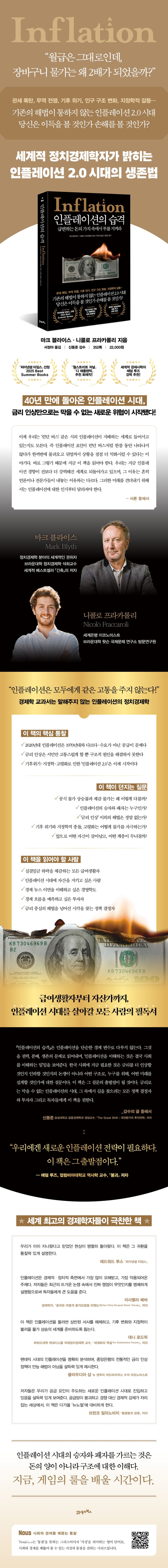 지금 우리에게 필요한 것은 인플레이션에 대한 막연한 두려움이나 해묵은 대응책이 아니라, 그 구조를 정확히 이해하고 전략적으로 대응하는 지혜다. 『인플레이션의 습격』은 급변하는 돈의 가치 속에서 부를 지키고, 새로운 인플레이션 시대를 현명하게 헤쳐나갈 나침반이 되어줄 것이다.