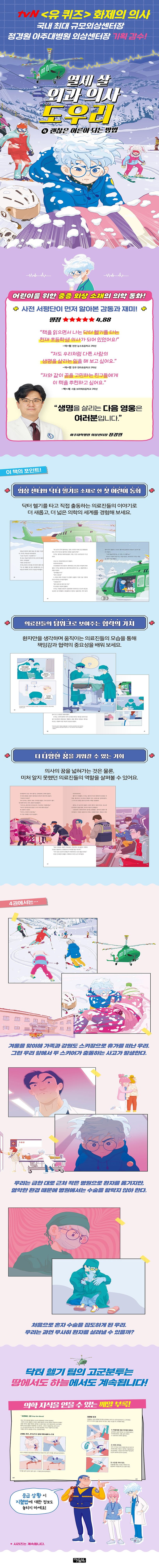 〈복제인간 윤봉구〉 임은하 작가가 〈열세 살 외과 의사 도우리〉 시리즈, 네 번째 책으로 돌아왔습니다. 아주대병원 외상 센터의 감수를 통해 선정한 사건들을 재구성하여 긴박한 외상 센터와 닥터 헬기의 이야기를 사실적으로 담아냈습니다. 이번에는 강원도의 한 시골 병원에서 처음으로 수술을 집도하게 된 우리와, 베란다 추락 사고로 외상 센터에 실려 온 하연이의 친구 주하의 이야기를 담았습니다.