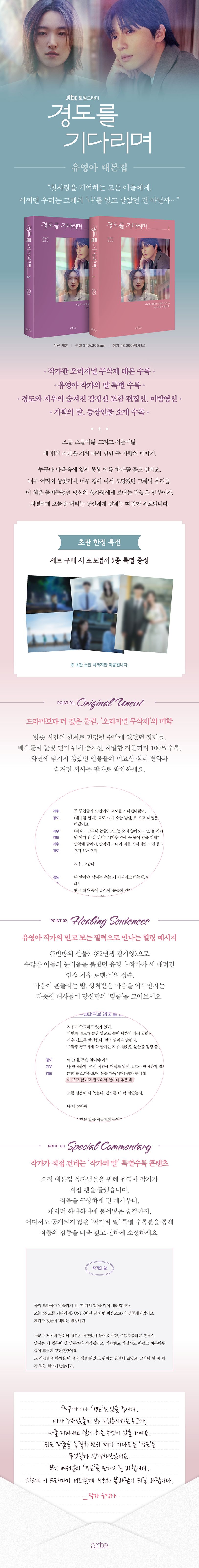 영상은 빠르게 흘러가고, 되돌려 보더라도 그 감정을 온전히 붙잡기 어렵다. 대본집 『경도를 기다리며』는 그런 간절함에 대한 응답이다. 마음을 울리는 장면, 짧게 지나갔지만 여운이 깊었던 순간, 경도와 지우의 숨겨진 감정선을 포함한 편집신과 미방영신까지 전 12회의 대본을 유영아 작가의 오리지널 무삭제 버전으로 수록했다. 화면에 담기지 않았던 인물들의 미묘한 심리 변화와 숨겨진 서사, 배우들의 눈빛 연기 이면에 자리했던 치밀한 지문까지 작가가 처음 썼던 그대로의 이야기를 만날 수 있다. 또한 유영아 작가가 특별히 집필한 ‘작가의 말’과 기획 의도, 등장인물 해설 등 대본집에서만 만날 수 있는 콘텐츠도 추가로 구성했다.