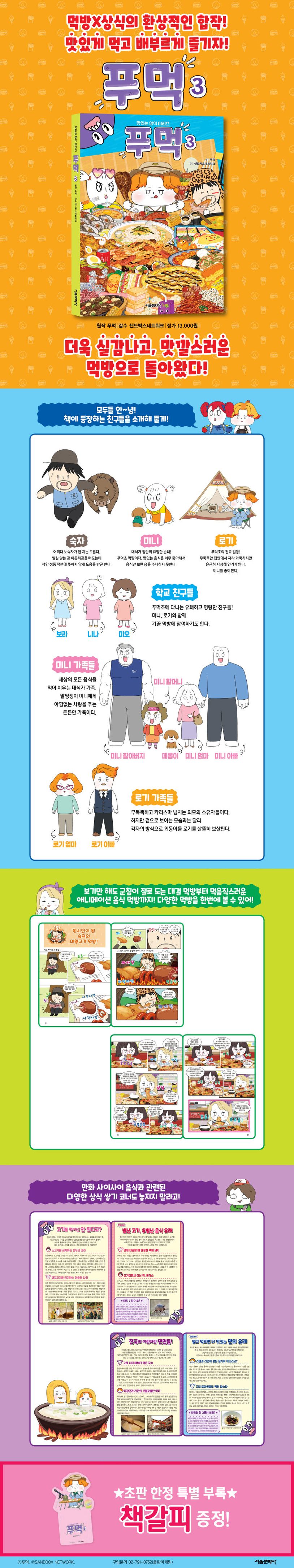 유튜브 먹방 애니메이션 ‘푸먹’을 책으로 만나 보자! 숙자와 미니, 그리고 로기 세 명의 개성 강한 캐릭터들의 풍성한 먹방을 보다 보면 나도 모르게 침이 꼴깍 넘어간다. 에피소드마다 감동과 웃음을 담은 짤막한 이야기도 맛깔스럽게 버무렸다. 사이사이 음식과 관련된 다양한 상식을 쌓는 코너도 잊지 말자!