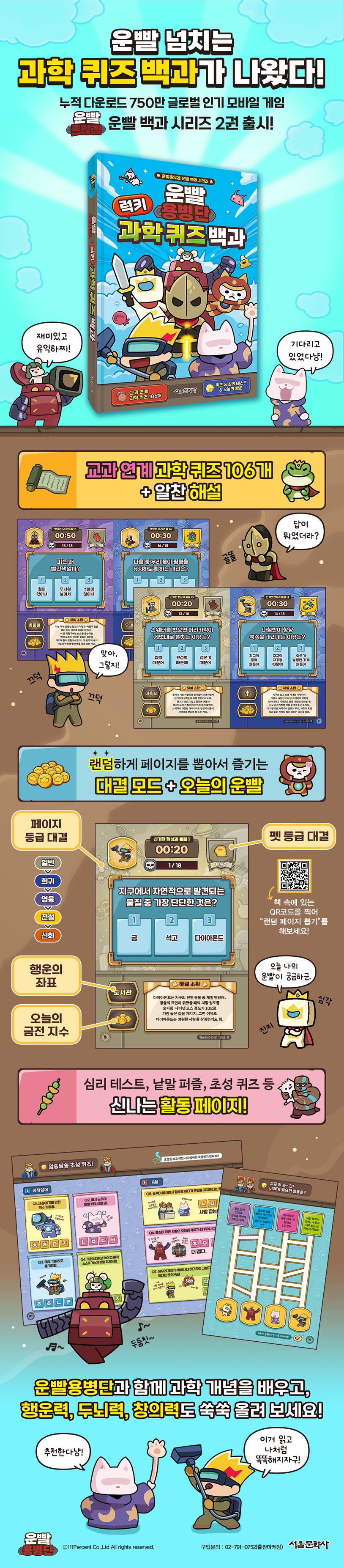글로벌 인기 모바일 게임 “운빨존많겜”의 세계관을 바탕으로 한 『운빨용병단 과학 퀴즈 백과』가 출간되었다. 교과 연계는 물론, 운빨용병단의 인기 캐릭터들과 찰떡궁합인 6가지 주제별로 과학 퀴즈 106개를 담았고, 자세한 해설을 수록하여 과학 개념을 쉽고 재미있게 배울 수 있도록 하였다.