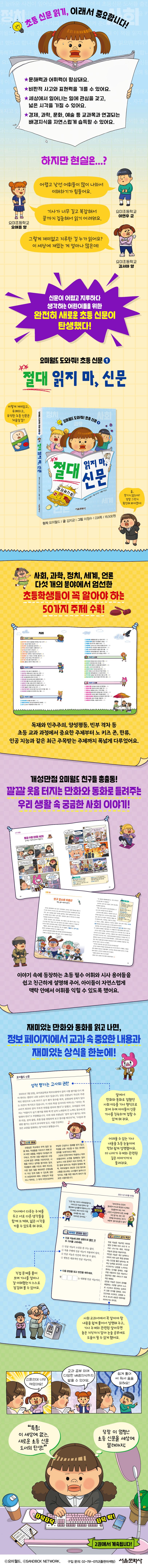 《요미월드 도와줘! 초등 신문1. 절대 읽지 마, 신문》은 이러한 아이들의 고충을 해결해 주기 위해 기획된 신개념 초등 신문 도서다. 유튜브 채널 ‘요미월드’ 속 개성 넘치고 매력 있는 캐릭터들이 등장하는데, 이들이 펼치는 깔깔 웃음이 터지는 만화와 동화를 보다 보면 아이들은 자신도 모르는 새 뉴스 속으로 빠져들게 된다. 이야기 속에서 어려운 시사용어나 꼭 알아야 하는 필수 어휘들도 쉽게 설명해 주어 문맥 속에서 자연스럽게 배울 수 있게 하였다.