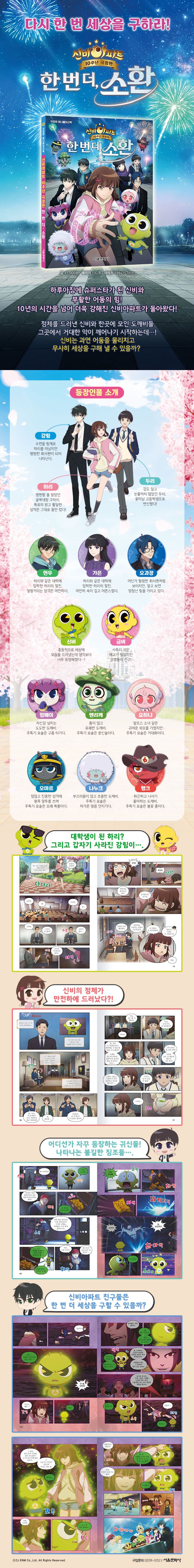 극장판에서느꼈던박진감넘치는전개와벅찬감동을다시한번!애니메이션북<한번더,소환>은극장판의역동적인액션과감동적인장면들을고화질스틸컷으로완벽하게재현했다.성인이된주인공들의상세한캐릭터소개는물론,새롭게등장하는도깨비들까지수록되어있어소장가치를높였다.책장을넘길때마다극장에서느꼈던긴장과설렘을다시한번더느낄수있다.줄거리대학생이된하리.신비는예전처럼하리와놀고싶지만,학교다니랴아르바이트하랴정신없기만한하리탓에약속은자꾸만미뤄진다.그러던중,귀신을잡으러다니던PD에게신비의정체가발각된다.신비는자신의정체를세상에공개하고,하루아침에스타가된다.신비의등장으로전세계곳곳에숨어살던도깨비들이하나둘나타나고,도깨비들은광화문에모여축제를벌인다.모두가축제를즐기던그순간,오랜시간잠들어있던‘지하국대적’이부활하고신비와도깨비들은위기에처하게된다.과연신비는세상을구할수있을까?*인증유형:공급자적합성확인