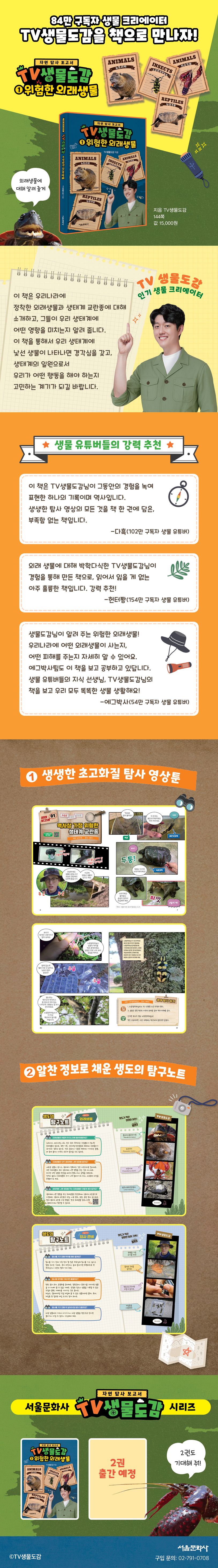 tv생물도감이 우리나라 곳곳을 돌아다니며 외래종을 찾고, 외래종이 환경에 어떤 피해를 주는지 알려 줘요. 어린이들이 생도와 함께 탐사를 떠나는 기분을 느낄 수 있도록 실제 탐사 영상을 캡처하여 생생하게 구성했어요.