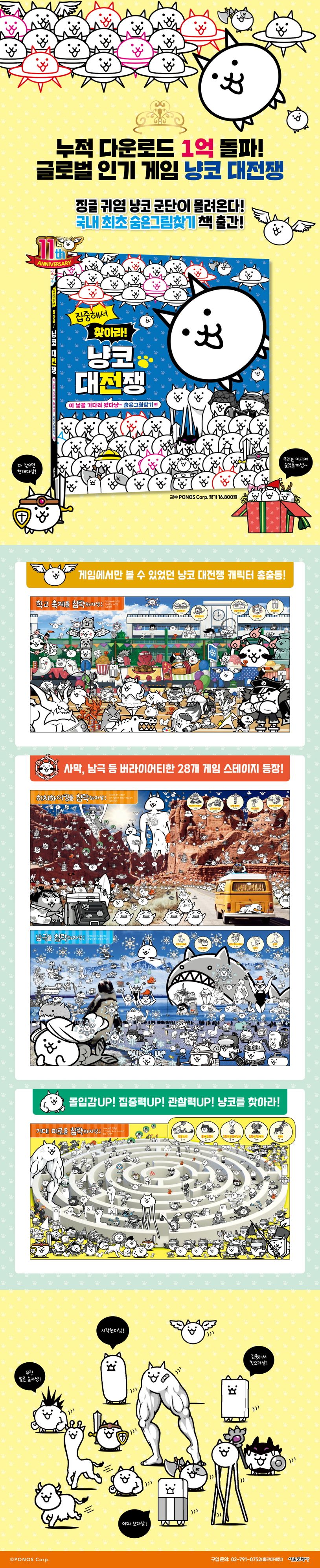 징글 귀염 냥코 군단이 몰려온다! 누적 다운로드 1억을 기록하며 전 세계적으로 큰 인기를 얻은 『냥코 대전쟁』의 국내 첫 숨은그림찾기 책이 출간되었습니다. 게임에서만 볼 수 있었던 냥코 대전쟁 캐릭터 총출동! 사막, 남극, 토성 등 버라이어티한 28개의 게임 스테이지에서 등장하는 냥코들을 만나볼 수 있어요. 몰입감 UP! 집중력 UP! 관찰력 UP! 게임에서는 볼 수 없었던 다채로운 장면 속으로! 찾든 못 찾든 그 자체로 즐거운 숨은그림찾기, 지금 시작해요!