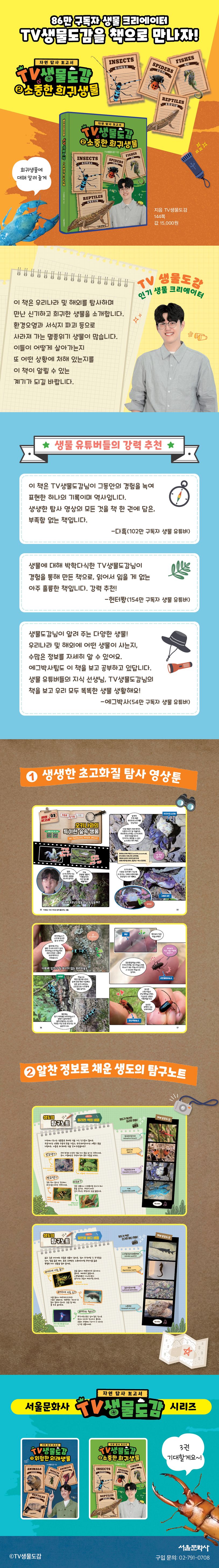 86만 구독자 생물 크리에이터 TV생물도감이 대한민국과 세계 곳곳을 다니며 기록한 탐사 일지와 정보를 담은 책! 초고화질로 생생한 자연 탐사 영상툰과 알찬 정보가 가득한 탐구 노트를 만나 보세요.