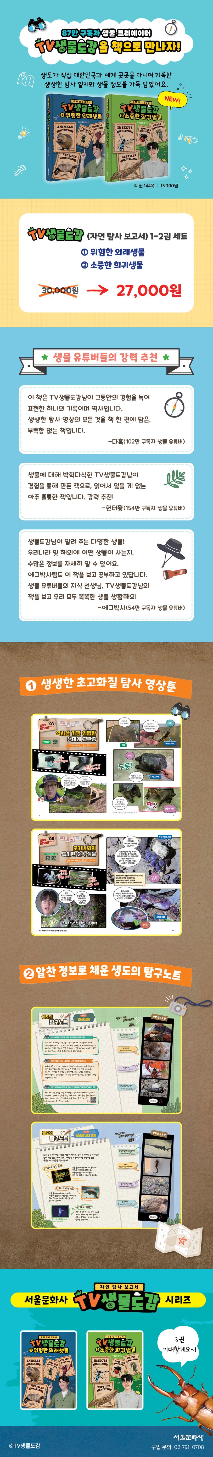 87만 구독자 생물 크리에이터 TV생물도감이 대한민국과 세계 곳곳을 다니며 기록한 탐사 일지와 정보를 담은 책! 초고화질로 생생한 자연 탐사 영상툰과 알찬 정보가 가득한 탐구 노트를 만나 보세요.