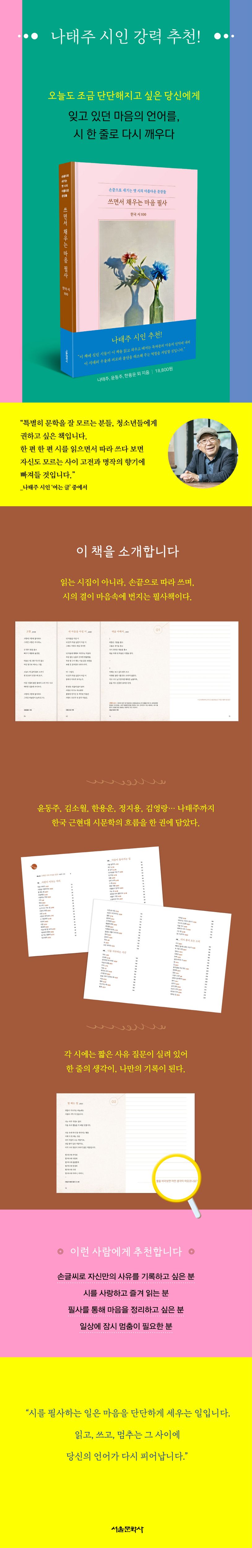 그리고 책 속으로 들어가 보면 먼저 시 한 편이 실려 있고, 그 옆으로 필사할 수 있는 노트가 마련돼 있다. 예를 들어 운동주의 〈별 헤는 밤〉을 읽고 그 아래 윤동주 시인에 대한 정보를 살필 뿐만 아니라 “밤하늘의 별을 보면 어떤 생각이 떠오르나요?” 같은 짧은 질문을 통해 시와 독자 사이에 다리를 놓는 사유의 시간을 마련했다. 이 모든 과정은 시인이 느꼈던 감정의 결을 손끝으로 따라가는 명상 같은 시간이 된다.