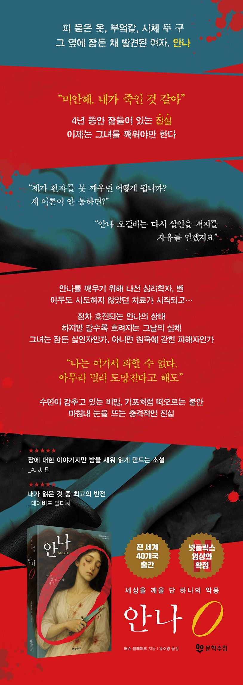 “우리둘다꿈이얼마나위험할수있는지알고있죠”진실로지금깨어있는이는누구인가심리스릴러,그이상의스릴러인간은평균33년을잠으로보낸다.그러나꿈이아닌잠들어있는동안의현실을인식하는이는아무도없다.몸과마음이멀찍이떨어져삶에커다란구멍을만드는시간.하지만어떤이들은우리가생각하는것보다더많은행동을자면서해낸다.체념증후군을치료하기위해안나의과거를조사하던벤은그녀가몽유증상을앓고있었다는점을발견한다.그리고안나가살인자가되었던‘그날’에집중하는대신몽유증세를일으켰던사건들,그녀의삶곳곳에새겨진체념의순간들을수집하기시작한다.벤은안나가즐겨듣던음악,익숙한향,사랑하던대상을통해그녀가잃어버린희망을돌려놓고자하고,무의식너머에갇혀있던안나는점점의식으로손을뻗기시작한다.그리고….그래도아직다른걱정거리가있었다.그녀를잠에서깨우는것이감옥문을잠그는결과를낳지않을까.치료하고싶은것이지벌을주려는게아니라는맹세를배신하는꼴이되지않을까.(…)나는침대옆에서서안나를내려다보며간병인에게서걸려왔던전화를다시떠올렸다.그말이모든것을바꾸어놓았다.“환자가방금눈을떴습니다.”(243p)그러나안나의상태가호전될수록드러나는그녀의과거는벤이전혀예상하지못한그림이었다.나아가4년전의사건,그보다훨씬이전부터엮여있던자신과안나의관계를감각하면서사건은기이한방향으로흘러가게되고…마침내잠들어있던자와깨우려던자의위치가조금씩변하기시작한다.안나를잠에서깨우면모든전말이밝혀지리라는기대는그녀가눈을뜨는순간무너지고,그제야독자들은눈꺼풀아래있던안나의눈동자에더깊은비밀이깃들어있음을알게된다.나아가안나와벤,환자와의사,피의자와피해자라는이분법적인관계를일제히무너뜨리면서이책은‘심리스릴러’라는단어에담기지않는또하나의장르적지점을개척해낸다.잠깨어있던독자를잔혹한악몽한가운데로이끄는소설,《안나O》를통해가장우아한방식으로무너져내리는진실을확인해보길바란다.