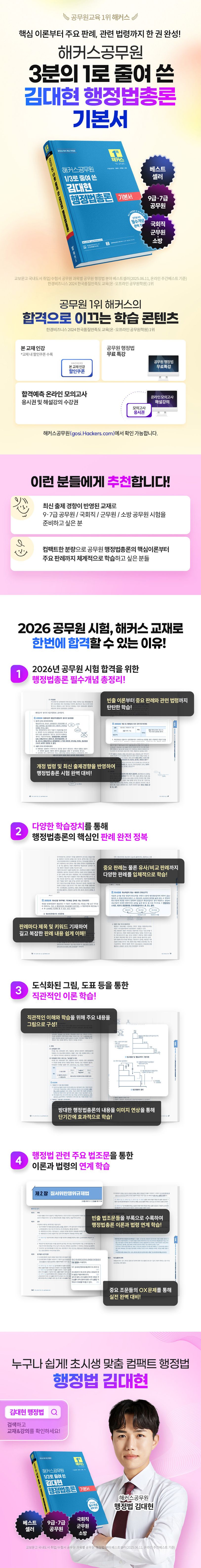 "공무원교육1위,해커스공무원!"합격을위한필수개념총정리[이런분들에게추천합니다]1.최신출제경향이반영된교재로7,9급공무원/국회직/군무원/소방공무원시험을준비하고싶은분들2.컴팩트한분량으로공무원행정법총론의핵심이론부터주요판례까지체계적으로학습하고싶은분들[해커스교재만의특장점]1.2026년7,9급공무원/국회직/군무원/소방공무원대비!합격을위한행정법총론필수개념총정리1)개정법령및최신출제경향이반영된교재를통하여행정법총론시험에정확하게대비할수있습니다.2)시험에자주출제되는이론부터중요판례와관련법령까지폭넓게수록하여기초부터실력까지탄탄하게다질수있습니다.2.다양한학습장치를통해행정법총론의핵심인판례완전정복1)실제시험에서접하게되는지문들이대부분판례인점을고려하여,중요판례는물론그와관련된유사/비교판례까지수록하였습니다.이를통해다양한판례를입체적으로학습할수있습니다.2)길고복잡한판례의내용을쉽게이해할수있도록판례마다제목및키워드를기재하여판례의핵심내용을한눈에파악할수있습니다.3.컴팩트한분량및도식화된그림,도표등을통한직관적인이론학습직관적인이해와학습을위해주요내용을그림으로구성하여수록하였습니다.이를통해방대한행정법총론의내용을단기간에효과적으로학습할수있으며,이미지연상을통해내용을쉽게이해할수있습니다.4.행정법관련주요법조문을통한이론과법령의연계학습1)시험에서자주출제되는주요법조문들을정리하여부록으로수록하였습니다.이를통해행정법총론이론과법령을연계한학습을할수있습니다.2)중요조문들에○?문제를수록하여학습한조문이어떻게문제로출제되는지확인하고,실전문제에완벽하게대비할수있습니다.[공무원시험합격을위한해커스공무원만의추가학습자료(해커스공무원gosi.Hackers.com)]1.본교재인강(할인쿠폰수록)2.공무원행정법무료특강3.합격예측온라인모의고사(응시권및해설강의수강권수록)[공무원교육1위]한경비즈니스2024한국품질만족도교육(온·오프라인공무원학원)1위