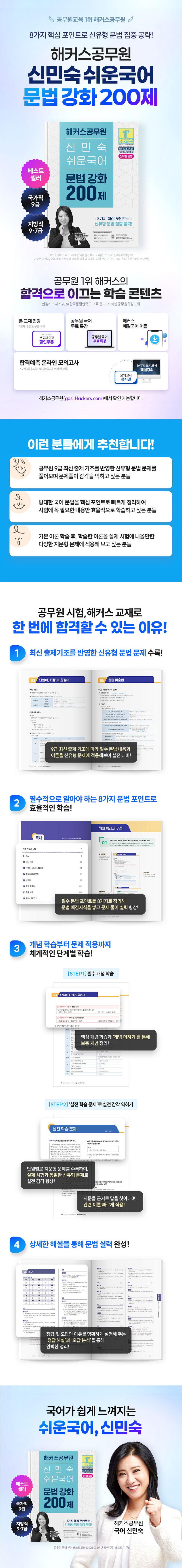 "공무원교육1위,해커스공무원"한경비즈니스2024한국품질만족도교육(온오프라인공무원학원)1위8가지핵심포인트로신유형문법집중공략![이런분들에게추천합니다]1.공무원9급최신출제기조를반영한신유형문법문제를풀어보며문제풀이감각을익히고싶은분들2.방대한국어문법을핵심포인트로빠르게정리하여시험에꼭필요한내용만효율적으로학습하고싶은분들3.기본이론학습후,학습한이론을실제시험에나올만한다양한지문형문제에적용해보고싶은분들[해커스교재만의특장점]1.최신출제기조를반영한신유형문법문제로100%전면개정되었습니다.2025년9급최신출제기조에따라필수적으로학습해야하는문법내용과학습한이론을신유형문제에적용해보며실전에완벽대비할수있습니다.2.필수적으로알아야하는8가지문법포인트를통해효율적인학습이가능합니다.반드시알아야하는필수문법포인트를8가지로정리하여방대한공무원국어문법을효율적으로익히고문법배경지식을쌓아문제를빠르게푸는힘을기를수있습니다.3.개념학습부터문제적용까지체계적인단계별학습이가능합니다.1)[1단계]필수개념학습필수적으로알아야할핵심개념학습과함께‘개념더하기’를통해추가로더알아두면좋을보충개념까지확실히정리할수있습니다.2)[2단계]‘실전학습문제’로실전감각익히기-각단원별로지문형문제를수록하여,실제시험과동일한신유형문제를풀어보며문제풀이감각을익힐수있습니다.-주어진지문을근거로답을찾아내며,관련이론을지문에빠르게적용해보는연습을통해고득점에도달할수있습니다.4.상세한해설을통해문법실력을완성할수있습니다.앞서학습한이론을문제에적용하여풀어본후,정답인이유와오답인이유를명확하게설명해주는상세한‘정답해설’과‘오답분석’을통해이론을완벽하게정리할수있습니다.[단기합격을위한해커스만의추가학습콘텐츠-해커스공무원(gosi.Hackers.com)]1.본교재인강(교재내할인쿠폰수록)2.공무원국어무료특강3.합격예측온라인모의고사(교재내응시권및해설강의수강권수록)4.해커스매일국어어플