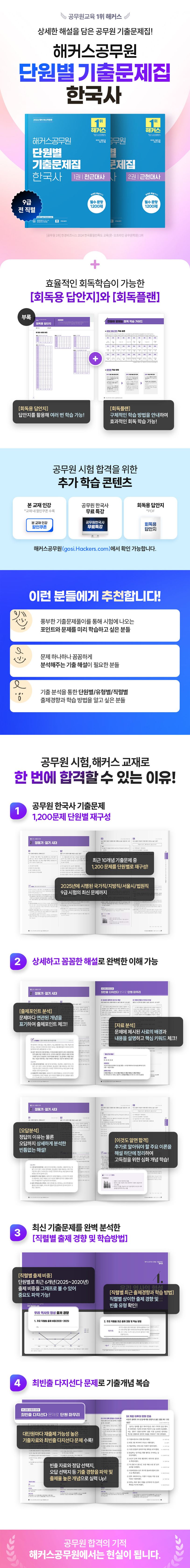 “공무원교육1위,해커스공무원”한경비즈니스2024한국품질만족도교육(온·오프라인공무원학원)1위상세한해설을담은공무원기출문제집![이런분들에게추천합니다]1.풍부한기출문제풀이를통해시험에나오는포인트와문제를미리학습하고싶은분들2.문제하나하나꼼꼼하게분석해주는기출해설이필요한분들3.기출분석을통한단원별/유형별/직렬별출제경향과학습방법을알고싶은분들[해커스교재만의특장점]1.2026년공무원시험대비!최신기출을완벽반영한공무원한국사기출문제1,200문제를단원별로재구성하였습니다.1)최근10개년(2025~2016년)의공무원한국사기출문제중주요직렬을중심으로엄선한총1,200문제를단원별로재구성하여수록하였습니다.2)2025년에시행된국가직/지방직/서울시/법원직9급시험의최신문제까지수록하였습니다.3)기본서를학습한수험생도기출문제를풀면서단원별핵심이론을통해다시한번개념을정리할수있습니다.2.상세하고꼼꼼한해설을통해한문제를풀어도완벽한이해가가능합니다.1)출제포인트분석문제마다연관된개념을표기하여출제포인트를짚어줍니다.2)자료분석문제에제시된사료의배경과내용을설명하고핵심키워드를짚어줍니다.3)오답분석정답의이유는물론오답까지상세하게분석해주는해설로빈틈없는학습이가능합니다.4)이것도알면합격추가로알아둬야할주요이론을해설하단에정리하여고득점을위해필요한심화개념까지학습할수있습니다.3.최신기출문제를완벽분석한[직렬별출제경향및학습방법]으로전략적학습이가능합니다.1)직렬별출제비중단원별로해당단원의내용이최근6개년(2025~2020년)시험에서얼마나출제되었는지그래프로제시하여한눈에출제비중을파악하고,집중학습해야할부분을알수있습니다.2)직렬별최근출제경향과학습방법직렬별로상이한최신출제경향을파악할수있으며,자주출제되는유형이무엇인지확인하고,직렬별학습방법을익힐수있습니다.4.최빈출다지선다문제를통해출제가능성이높은기출개념을복습할수있습니다.1)대단원마다다시출제될가능성이높은기출자료와선택지를담은최빈출다지선다문제를수록하였습니다.2)핵심기출문제를다지선다로풀어보면서자주출제되는자료와정답선택지,오답선택지의구성등기출경향을파악하고,출제가능성이높은기출개념을확실하게복습하여실력을다질수있습니다.5.[회독용답안지]와[회독플랜]으로효율적인회독학습이가능합니다.1)회독용답안지-교재에직접답을체크하지않고답안지를활용해문제를풀면서여러번학습이가능합니다.-여러번반복해문제를푸는수험생들의학습편의와약점파악을위해'회독용답안지'를수록하였으며PDF파일로도제공합니다.2)회독플랜무작정회독수만늘리는것이아니라회독수가늘어날수록학습효과를극대화할수있는'30일맞춤회독학습플랜'과구체적인학습방법을안내하여효과적인회독학습이가능합니다.[단기합격을위한해커스만의추가학습콘텐츠-해커스공무원(gosi.Hackers.com)]1.공무원인강(교재내할인쿠폰수록)2.공무원한국사무료특강3.회독용답안지(PDF)