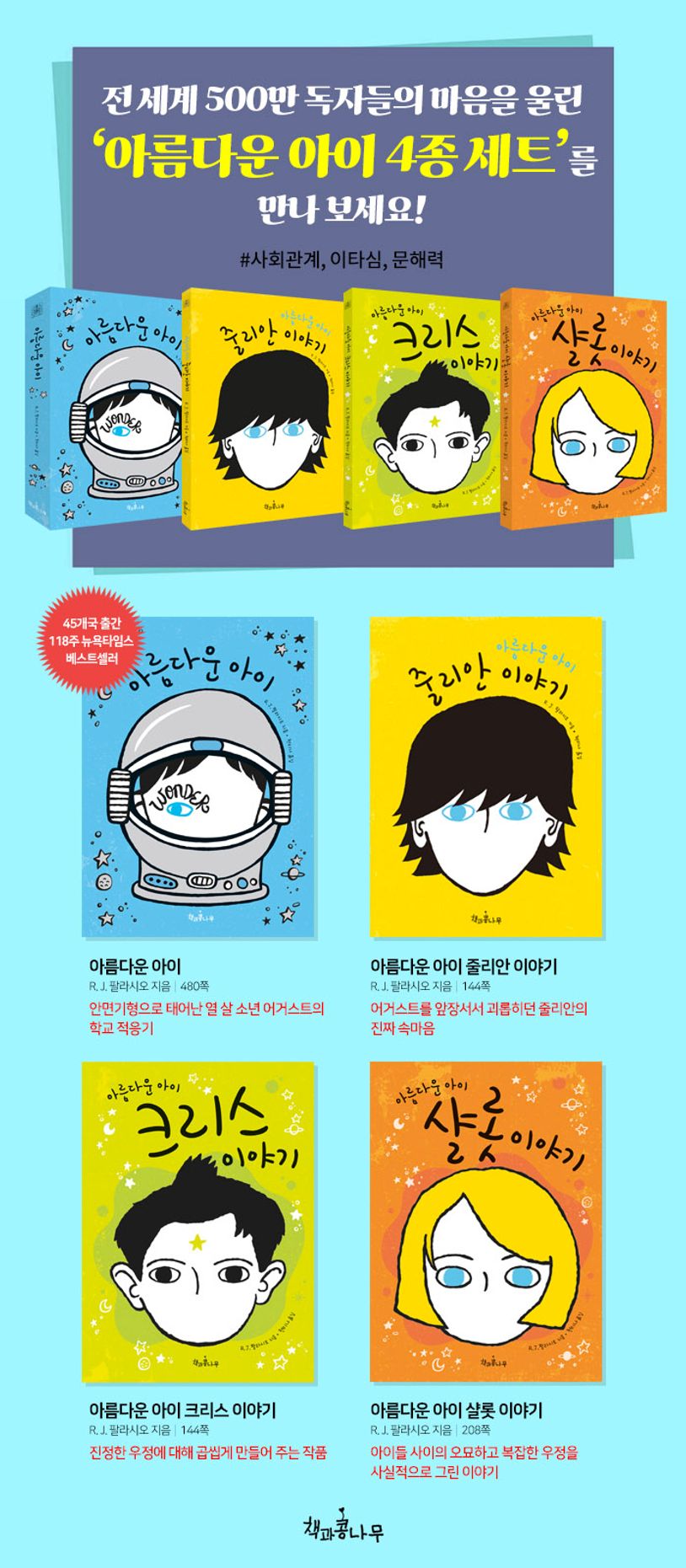 전 세계 독자들을 감동시킨 작가 R. J. 팔라시오의 아름다운 아이 4권으로 구성된 세트입니다. 안면기형으로 태어난 열 살 소년 어거스트의 학교 적응기 〈아름다운 아이〉, 어거스트를 앞장서서 괴롭히던 줄리안의 진짜 속마음을 표현한 〈아름다운 아이 줄리안 이야기〉, 진정한 우정에 대해 곱씹게 만들어 주는 작품인 〈아름다운 아이 크리스 이야기〉, 아이들 사이의 오묘하고 복잡한 우정을 사실적으로 그린 이야기 〈아름다운 아이 샬롯 이야기〉로 구성되어 있습니다.