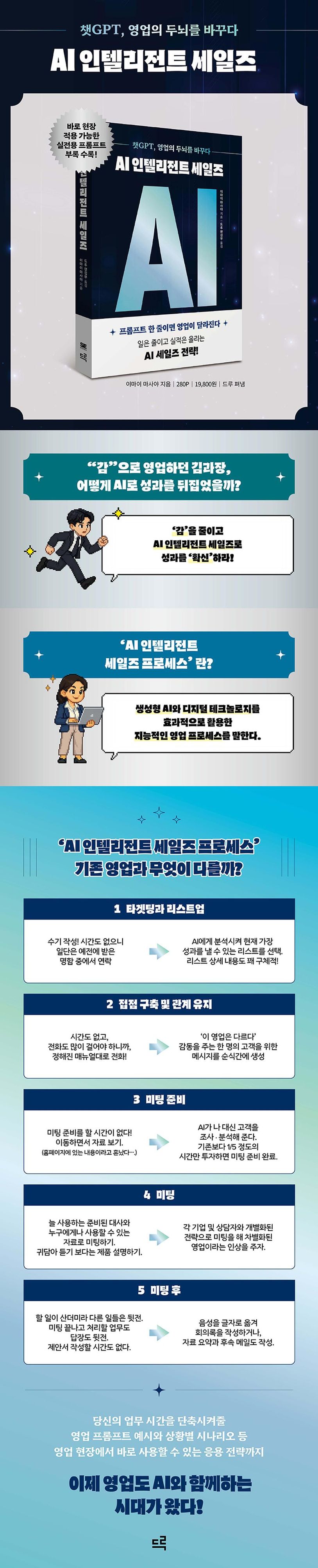 『AI 인텔리전트 세일즈』는 인공지능에 밀리지 않고 AI와 함께 성장하고 싶은 모든 영업인들을 위해 가장 현실적인 방안을 제시한다. 영업을 ‘혼자 하는 일’에서 ‘AI와 함께하는 일’로 바꾸고 싶다면 이 책이 그 전환의 첫 페이지가 될 것이다. 저자는 인공지능 기술을 활용하여 성과를 극대화하는 노하우와 전략을 상세히 담아내는 데 그치지 않고, AI가 단순 보조가 아닌 능동적 파트너로 작동하는 영업의 미래를 구체적으로 그려낸다. 고객 분석, 시장 파악, 제안서 작성, 미팅 준비 등 영업 전반의 업무 흐름을 프롬프트 하나로 바꾸는 방법을 단계별로 설명하고 영업 담당자가 바로 적용할 수 있는 실전 프롬프트 예시와 B2B·B2C를 아우르는 영업 시나리오까지 제공하고 있어 세일즈 전략 분석을 넘어 AI 기반 영업의 미래를 통찰하고 있다. 지금 당신의 영업 환경이 빠르게 바뀌고 있다면 이 책은 그 변화에 올라탈 수 있는 가장 빠른 전략서이다.