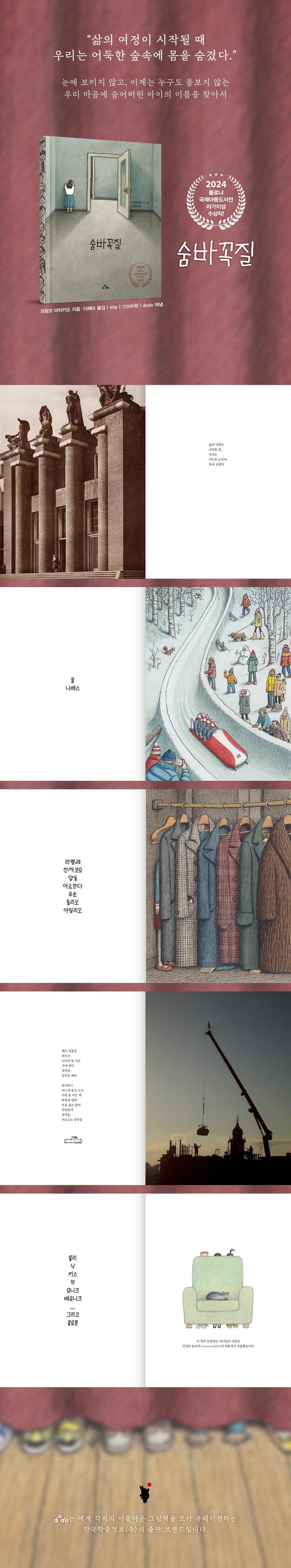 프랑코 마티키오의 《숨바꼭질》은 우리 마음 어딘가에 숨어 있는 ‘작은 나’를 찾아가는 작품이다. 책장을 넘기면 나무 뒤, 커튼 밑, 서랍 속에 몸을 감춘 아이들이 하나씩 모습을 드러낸다. 이름은 있지만 얼굴은 희미하고, 몸의 일부가 보이지 않거나 아예 사라져 흔적만 남아 있기도 하다. 마치 세상으로부터 잠시 숨은 듯 고요히 존재하는 아이들, 그곳에는 누구나 한때 품었던 순수함과 두려움, 그리고 보호받고 싶은 마음이 고스란히 녹아 있다.