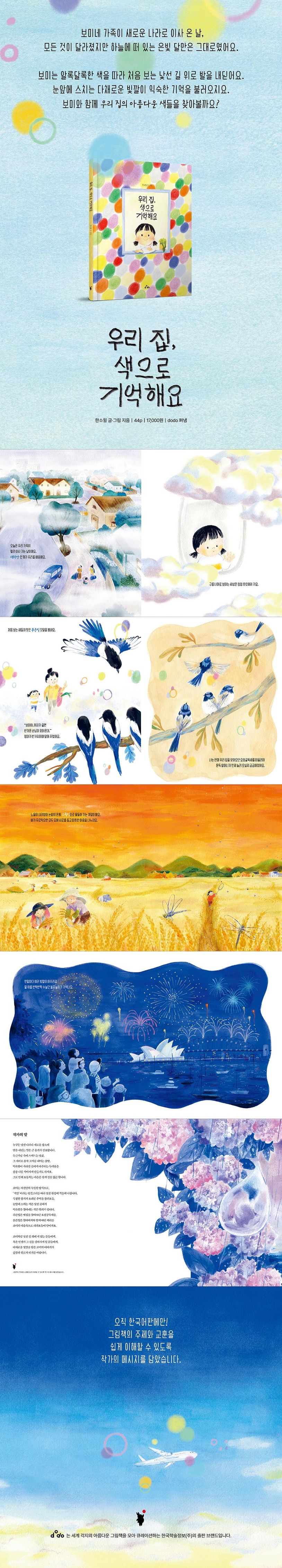 『우리 집, 색으로 기억해요』는 이사라는 낯선 상황에서 ‘색깔’이라는 연결고리를 따라 추억을 떠올리며 용기와 희망을 찾아가는 이야기입니다. 보미의 눈앞에 스치는 다채로운 색들은 낯선 곳에서 익숙함을 찾아내는 열쇠가 됩니다. 삶의 전환점을 맞이하여 낯선 길 위에 서 있는 이들에게 다정한 위로를 건네는 그림책입니다.