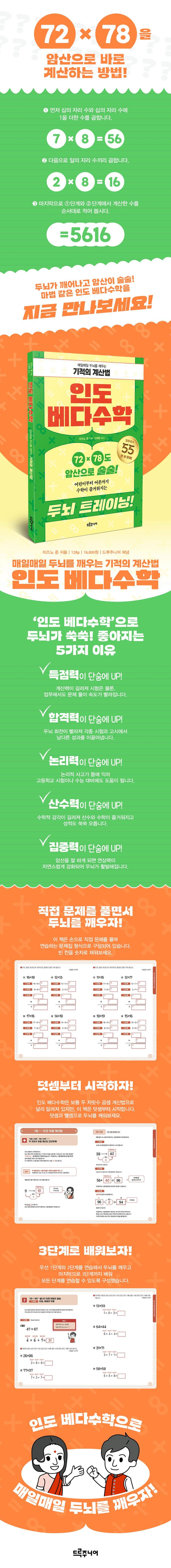 ‘인도 베다수학’이 바로 그 방법이다. 인도인들은 산수나 계산을 잘한다고 알려져 있다. 실제로 세계적인 IT 업계와 금융 업계 등 산수 능력이나 우수한 계산력이 필요한 분야에서 활약하는 인도인들이 많다. 그렇다면 인도인들은 왜 산수나 계산을 잘하는 것일까? 그 이유는 어렸을 적부터 독특한 계산법을 배웠기 때문이라고 알려져 있다. 인도에서는 초등학교 때 이미 ‘19×19’ 곱셈까지 외운다고 한다. 이 책에서는 바로 이러한 계산법을 배울 수 있는 ‘인도 베다수학’을 소개한다. 그중에서도 덧셈 한 가지, 뺄셈 한 가지, 곱셈 세 가지까지 총 다섯 가지를 엄선했다. 인도 베다수학의 매력적인 계산법을 직접 경험하고, 그 감동을 함께 느껴보길 바란다.