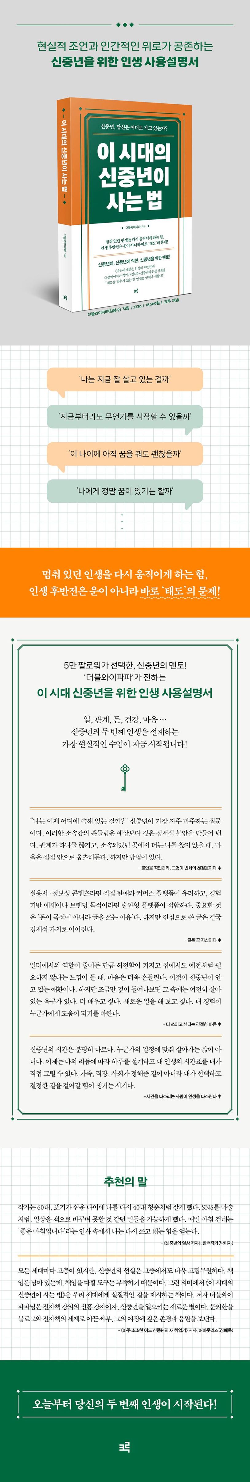 수많은 중년 독자들의 공감을 얻었던 《마흔에 깨달은 인생의 후반전》 저자 더블와이파파가 이번에는 신중년을 위한 인생 후반기의 실전 매뉴얼을 들고 돌아왔다. 《이 시대의 신중년이 사는 법》은 불안과 안정의 경계에 선 중년에게 퇴직 이후의 인생을 새롭게 설계하는 방법을 제시한다. 이 책은 한층 깊어진 시선으로 신중년의 삶을 정의하며 공감을 이끌어 내고, 중년 이후의 삶을 피로가 아닌 활력의 시기로 바꾸는 실질적인 해결책을 말한다. 안정적인 삶을 유지하기 위해 관계, 건강, 경제 등 신중년이 당면한 문제들을 구체적 사례와 함께 풀어가며 흔들리는 중년들이 안정적인 삶을 유지할 수 있도록 돕는다.