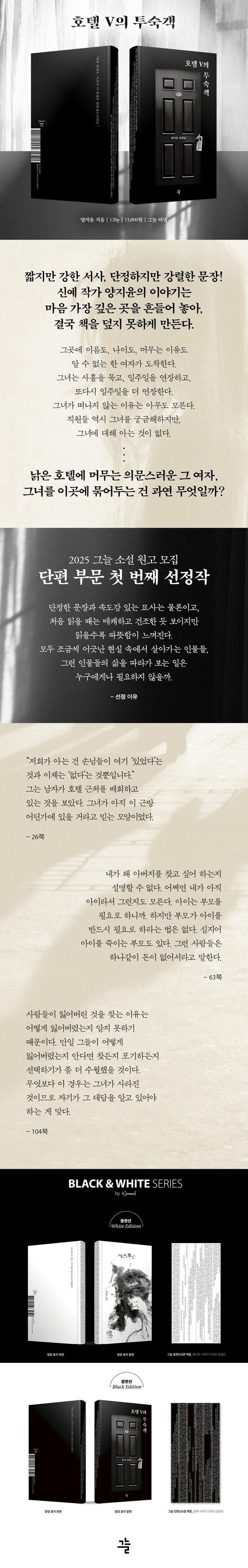 그늘단편선001『호텔V의투숙객』스릴러,판타지,SF,미스터리,문학을고루다뤄오던소설브랜드‘그늘’에서국내소설단편선을기획했다.우리문단에서주목받는작가들의반짝이는작품들을모아차례로선보일예정이다.세상의모습을담은‘문학’이라는거울은우리를비춘다.거기에는그책을읽는우리의삶도,그리고저마다다른에너지를가진젊은작가들의시간역시도담겨있다.장르에상관없이세상의목소리를내는작품이라면무엇이든모았다.한손에들어오는이책은언제어디에서든펼칠수있다.이야기가일상에스며드는동안작은파동이독자들에게전해지기를바라며소설을가로지르는다정한통찰을책의등에담았다.시리즈도서를책장에모아꽂으면힘이있는각각의서사들이모여하나의세계를짓게된다.기본에충실한흑백의이미지는독자들의내면에서조화를이룬다.그늘단편선시리즈는총세편의단편이담긴짧은단행본이다.앉은자리에서단숨에읽을수있지만마음에오래남는이야기들이다.우리일상에깃든,우리를닮은세편의이야기를통해서사를읽는기쁨과즐거움이독자들의마음에가닿기를바란다.기억은그곳에남아있다그곳에이름도,나이도,머무는이유도알수없는한여자가도착한다.그녀는사흘을묵고,일주일을연장하고,또다시일주일을더연장한다.그녀가떠나지않는이유는아무도모른다.직원들역시그녀를궁금해하지만,그녀에대해알수있는정보는한정적이다.이책의표제작인「호텔V의투숙객」은사람의마음에오래머무는기억에관해말하는이야기다.우리는늘어딘가에서기억을안고돌아온다고생각하지만,사실우리가그곳에기억을남겨두고돌아오는것은아닐까.단정한문장들은기억에관해그런물음들을던지며떠난것과남은것들의경계를허문다.낡은해변과호텔사이에는‘머무름’과‘떠남’이라는인간의시간이존재한다.그래서이호텔이라는공간은단순한배경이아니라,정지된시간을말하는어떤은유이자우리의기억이반사되는무대가되어준다.그리고그곳에는이름없는이들의사연과감정이쌓여만간다.그렇게이름과감정이쌓여폐허가된공간,그러나양지윤의세계에서그폐허는마냥로맨틱하지않다.대신사라짐의아름다움을말하고,그반복되는이별속에서도미세하게흔들리는인간의감각을포착하는작품이다.자기존재를증명하려는이들의이야기이책은‘머무름’과‘떠남’에관해말한다.예컨대「호텔V의투숙객」의인물은호텔을떠나지못하고,「우리의시간」의인물은가족을기다리며,「광인과나」의두인물은이해받지못한채서로의곁을맴돈다.어쩌면그들이묶여있는것은공간이아니라시간이아닐까.작가는이정지된시간속에서우리가가진결핍과애착을관찰한다.그의인물들은사회적중심에서밀려나있다.낡은호텔의종업원,불완전한가족의아이,그리고카페에서머무는한여자까지.하지만이책은그들을비정상이라고보거나패배자로보지않는다.오히려그들안에서가장순수한인간성을발견하려고한다.상처를지닌이들은타인을더잘이해할수있다.무너져본사람은자신이무너진자리에서누군가를잘품을수있다.이처럼떠나지못하는사람들의이야기속에서이들은연결된다.그래서이책속에펼쳐지는세계에서는관계에대한실패조차사랑의한형태일것이다.『호텔V의투숙객』은인간을낭만화하지않는다.하지만그런와중에포기하지도않는다.살아간다는건상실이없다는의미가아니라,상실이후에도누군가의곁에머물러주는일이아닐까.이소설은그역설을증명한다.그래서책의마지막페이지를덮으면절망대신조용한온기가남는다.우리가살아가는세계의아이러니란바로그런것이아닐까.