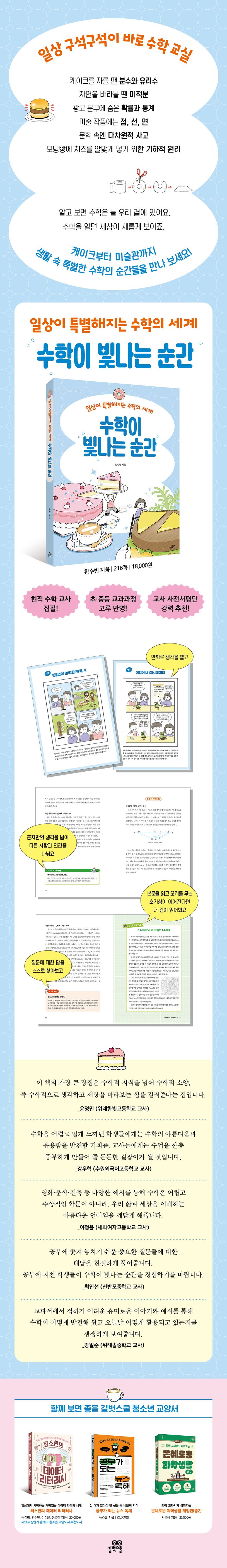 『수학이 빛나는 순간』은 일상 속에서 수학의 재미와 가치를 발견하게 하는 청소년 교양서입니다. ‘수, 데이터, 함수, 도형’이라는 네 가지 큰 주제를 통해 숫자의 기원에서부터 분수와 유리수, 데이터와 통계, 자연현상 속 미적분, 미술 작품 속 기하학까지 폭넓게 다룹니다. 복잡한 수식과 설명은 최대한 줄이고, 영화·문학·예술·건축 등 십 대들에게 친숙한 사례를 짚어보면서 ‘공부로서의 수학’이 아닌 ‘진짜 수학적 소양’이 무엇인지 쉽고 재밌게 안내합니다.