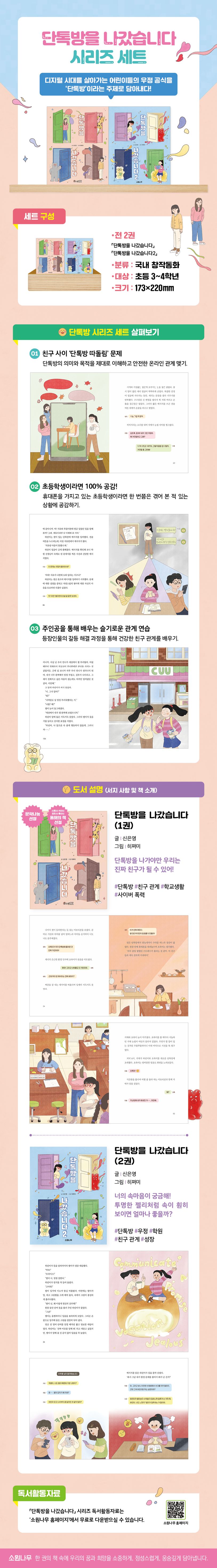 소원어린이책 14권. 《단톡방을 나갔습니다》는 어린이가 우정을 쌓는 방식을 ‘단톡방’이라는 온라인 채팅방을 통해 보여 주는 국내창작동화이다. 온라인이 발달하고 비대면 관계가 늘어남에 따라 소통하고 관계를 이어가는 방식은 계속해서 변화하고 있다. 《단톡방을 나갔습니다》 속 주인공 초록이와 친구들은 학교에서 흔히 일어날 수 있는 단톡방 왕따 사건의 실체를 보여 주고, 나아가 진정한 우정의 모습이 무엇인지 생각해 보게 한다.