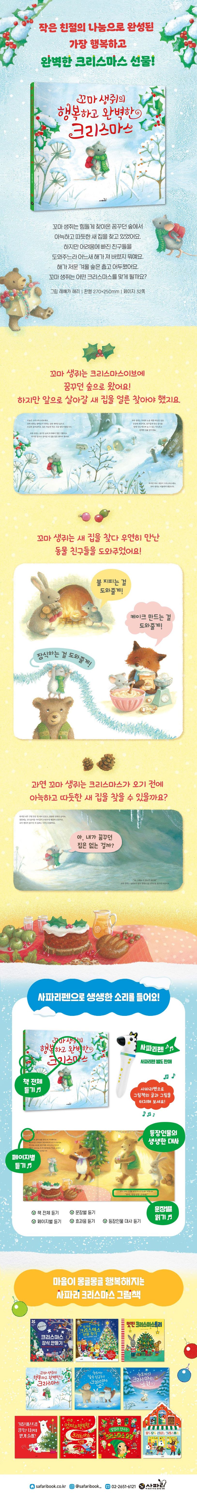 《꼬마 생쥐의 행복하고 완벽한 크리스마스》는 크리스마스의 진정한 의미인 “함께하는 마음과 나눔의 기쁨”으로가득 채워진 그림책이에요. 꼬마 생쥐는 함박눈이 내리는 크리스마스이브에 평소 꿈꾸던 나무 가득한 꼭대기 숲으로 이사 왔어요. 하지만 날이 저물기 전에 얼른 새 보금자리부터 찾아야 했지요. 따듯한 집에서 숲속 친구들과 맛난 음식을 함께 먹으며 크리스마스를 보내고 싶었거든요. 그런데 숲속에는 도움이 필요한 친구들이 많았어요. 마음 착한 꼬마 생쥐는 그냥 지나칠 수 없어 힘닿는 대로 도왔답니다. 추워서 덜덜 떠는 꼬마 토끼를 도와 불을 지피고, 쩔쩔 매는 꼬마 여우의 케이크 만들기를 거들고, 꼬마 곰의 집을 멋지게 꾸미는 일까지 말이에요. 그러다 보니 어느새 해가 저물어 버렸지 뭐예요. 꼬마 생쥐는 꿈꾸던 숲속 새 집에서 친구들과 따듯한 크리스마스를 보낼 수 있을까요?