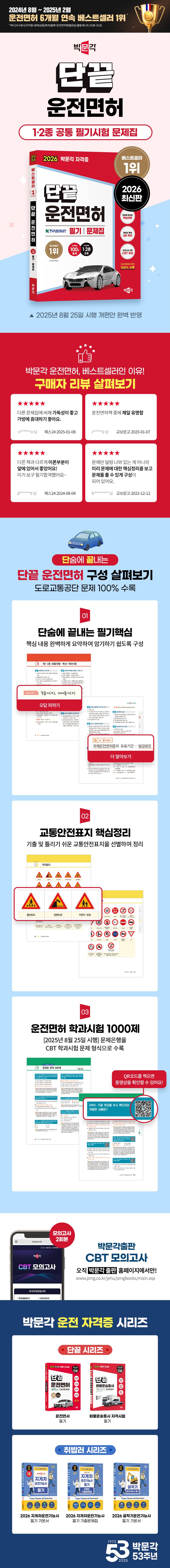 ㈜박문각출판에서『2026단끝운전면허1·2종공통필기시험문제집』교재가출간되었습니다.본서는최신개정된도로교통공단문제은행1000문항을완벽하게반영하여수록하였습니다.단숨에끝내는필기핵심으로핵심내용을요약정리할수있도록하였고,한눈에보이는정답표시로빠른문제풀이가가능하도록하였습니다.또한시험에출제되는교통안전표지만따로정리하여암기할수있도록하였고,동영상문제QR코드를각문제옆에수록하여빠르게재생할수있도록하였습니다.더불어박문각출판홈페이지에접속하면CBT실전모의고사3회분을풀어볼수있습니다.본서를통해최신운전면허시험의출제경향을파악하고핵심내용을정확하게숙지한다면보다빠르고확실하게합격하실수있을것입니다.수험생여러분들의합격을기원합니다.