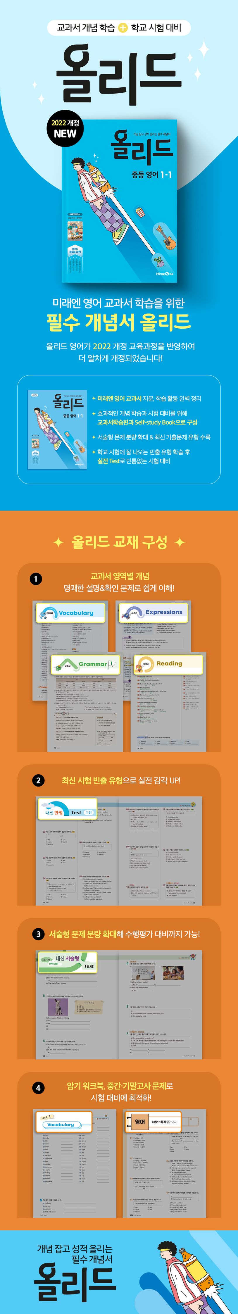 “개념 잡고 성적 올리는 필수 개념서”인 『올리드』는 교과서 개념을 꼼꼼하게 잡아 학교 시험을 확실하게 대비할 수 있는 교재입니다. 교과서 본문과 학습 활동의 핵심 개념을 꽉 잡아 주는 [교과서학습편]과 단원별 암기워크북과 중간/기말고사 문제로 시험 대비에 최적화된 [Self-study Book]으로 구성되어 있습니다. 『올리드 영어』는 『미래엔 영어 교과서』를 배우는 학생들이 시험을 대비하여 꼭 학습해야 할 교재입니다.