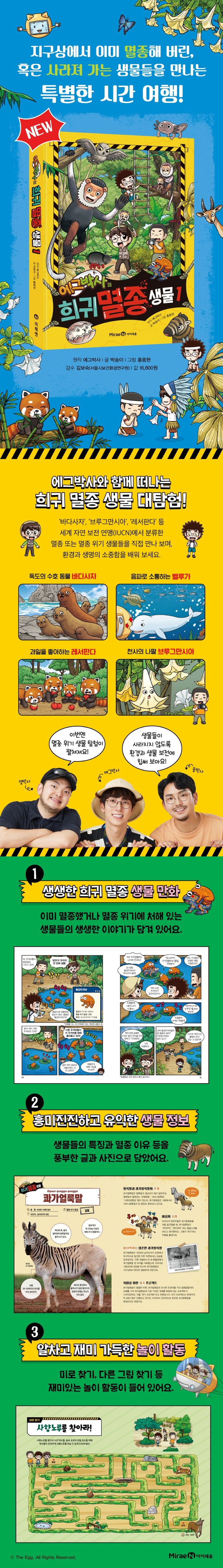 《에그박사의 희귀 멸종 생물》에는 이미 멸종했거나 멸종 위기에 처해 있는 생물들을 직접 만나는 이야기가 담긴 ‘만화 에피소드’, 멸종 위기 생물들의 특징과 멸종 이유 등을 담은 ‘생물 정보’, 미로 찾기 등을 담은 재미 가득한 ‘놀이 활동’이 수록되어 있습니다.