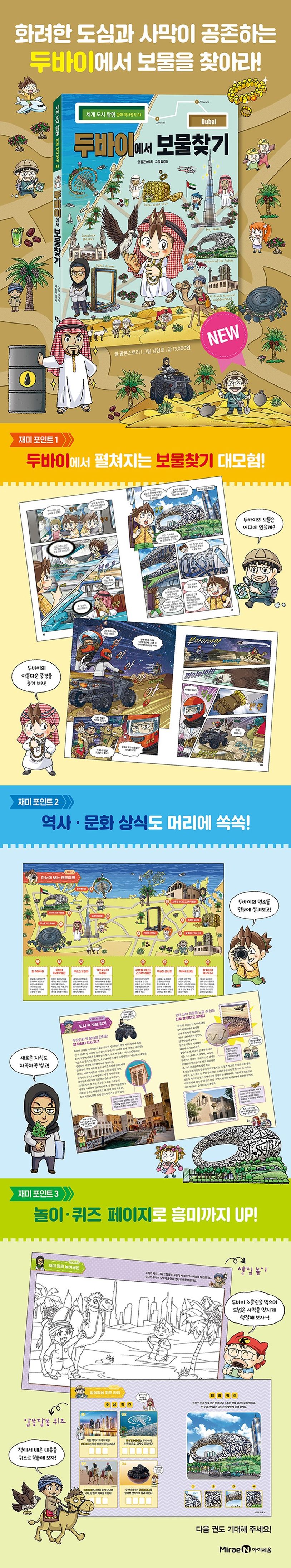 ≪세계 도시 탐험 만화 역사상식≫ 시리즈 31권은 아랍 에미리트의 두바이에서 펼쳐집니다. 보물을 찾기 위해 고군분투하는 주인공들의 흥미진진한 이야기와 더불어, 두바이에 대한 기본 상식과 역사를 알기 쉽게 정리한 정보 페이지가 수록되어 있어 새로운 지식을 쌓을 수 있어요. 또, 색칠 놀이와 알쏭달쏭 퀴즈 페이지를 실어 재미까지 높였습니다.