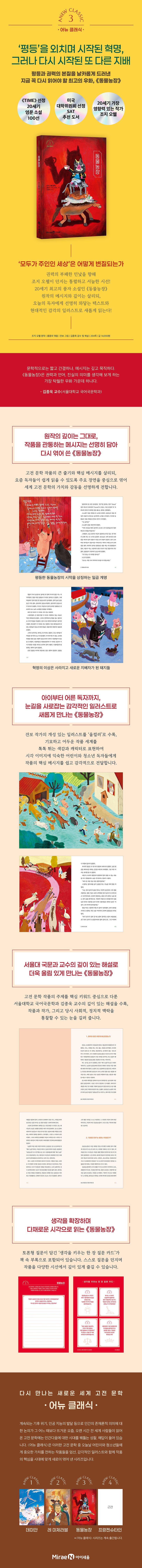 조지 오웰만의 비판 의식이 담긴 담백하고 건조한 문체의 특징을 살려 엮은 글, 《동물농장》의 어두운 작품 분위기와 모순되는 강렬한 컬러로 작품의 기묘한 분위기를 강조한 잔보 작가의 일러스트, 서울대 국문과 교수의 깊이 있는 해설이 담긴 〈어뉴 클래식〉 시리즈의 세 번째 작품인 《동물농장》을 통해 많은 독자들이 이 작품이 전하는 강렬한 메시지와 감동을 새롭게 만날 수 있을 것입니다.