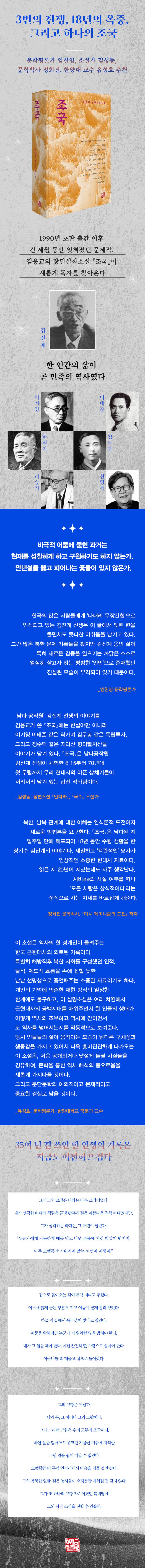 이 책은 남파 공작원 김진계 옹이 구술한 이야기를 토대로, 젊은 시절 김응교 작가가 집필한 장편실화소설이다. 『조국』 속에는 한설야, 이기영, 이태준 같은 문인들부터, 독립투사 김두봉, 지리산 항미 빨치산 정순덕, 대전교도소 시절의 신영복까지, 20세기 한국 현대사의 굵직한 인물들이 등장한다. 저자의 문장은 이들을 단순한 인명이 아니라 살아 움직이는 역사의 증언자로 불러낸다. 2025년 현대가 알 수 없는 치열한 투쟁의 시간을 저자의 생생한 문장으로 만나볼 수 있다.
