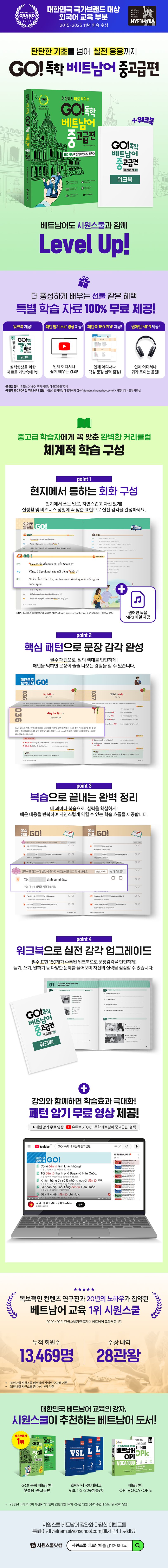 『GO! 독학 베트남어 중고급편』은 현지에서 가장 많이 쓰는 표현 150개와 활용도 높은 회화문으로 구성한 중고급 교재입니다. 실용적인 표현뿐만 아니라 핵심 문법까지 익힐 수 있어 베트남어의 문장 구조까지 확실하게 파악할 수 있습니다. 또한 워크북을 풀어보며 듣기, 쓰기, 말하기까지 다양한 영역을 학습할 수 있도록 구성하였습니다.
