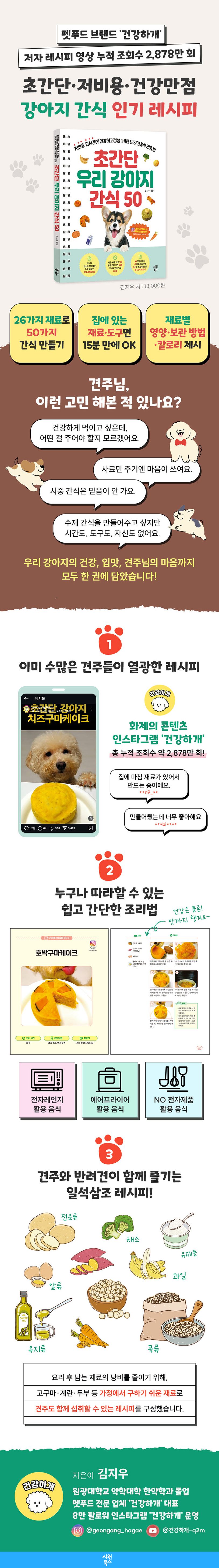 강아지에게 건강하고 맛있는 음식을 만들어 주고 싶지만 어떤 게 맛있는지, 뭐가 건강한지, 어떻게 만들어야 할지를 잘 몰라 현실적인 어려움에 부딪혀 포기하는 경우가 많습니다. ‘주식 외의 간식을 내 가 직접 만들어서 주고 싶다’, ‘우리 강아지 맞춤 간식을 만들고 싶다’, ‘그러나 시간이나 비용이 많이 들지 않고 간단한 과정으로 만들었으면 좋겠다’ 등의 생각을 가진 반려인들을 위해 〈초간단 우리 강아지 간식 50〉이 탄생했습니다. 여러분의 반려견 사랑에 보탬이 되어 드릴게요!