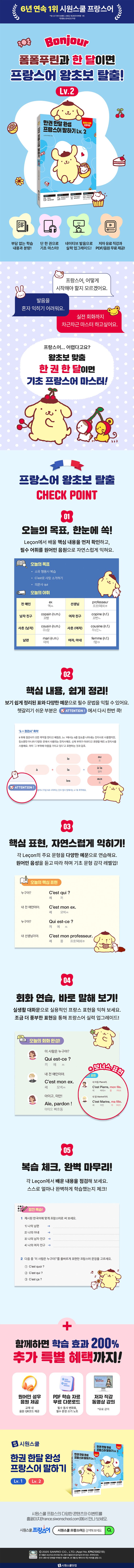 『한권 한달 완성 프랑스어 말하기 Lv. 2』은 프랑스어 기초부터 실전 회화까지 한 달 만에 마스터할 수 있도록 구성된 교재입니다. 누구나 쉽고 부담 없이 프랑스어를 시작할 수 있도록 어려운 문법이나 과한 설명은 덜어 내고, 초보자를 위한 생활 속 ‘진짜 회화’를 최대한 담아냈습니다. 『한권 한달 완성 프랑스어 말하기 Lv. 2』과 함께 프랑스어 왕초보 탈출, 시작해 보세요!