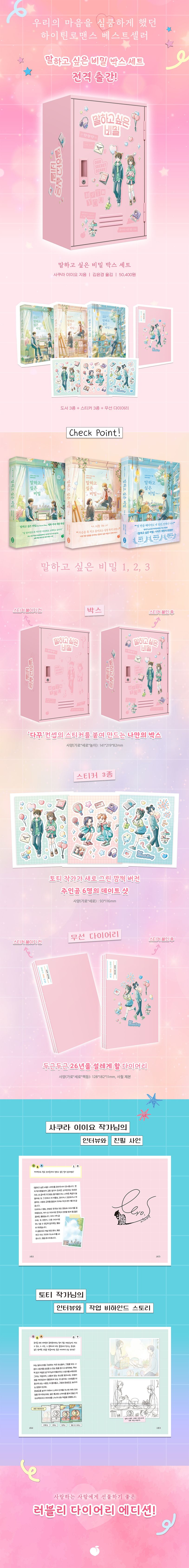 그동안10대들의풋풋한연애,사춘기시절특유의복잡미묘한관계와감성을섬세하고도다정하게묘사하여큰사랑을받아온저자는,마침내메가히트작〈말하고싶은비밀交換ウソ日記〉시리즈로하이틴로맨스부분에서범접할수없는위치에올랐다.2017년부터지금까지총네권(4권은다른작가들과함께쓴앤솔러지)이출간된이시리즈는‘청춘시절의사랑과마음의상처를그린수작’으로평가받으며,10대여학생들사이에서오랫동안사랑받아왔다.지금껏누적판매부수70만부를돌파,장기베스트셀러로자리매김했으며,원작소설의인기에힘입어1권은2023년일본에서영화로개봉되었다.