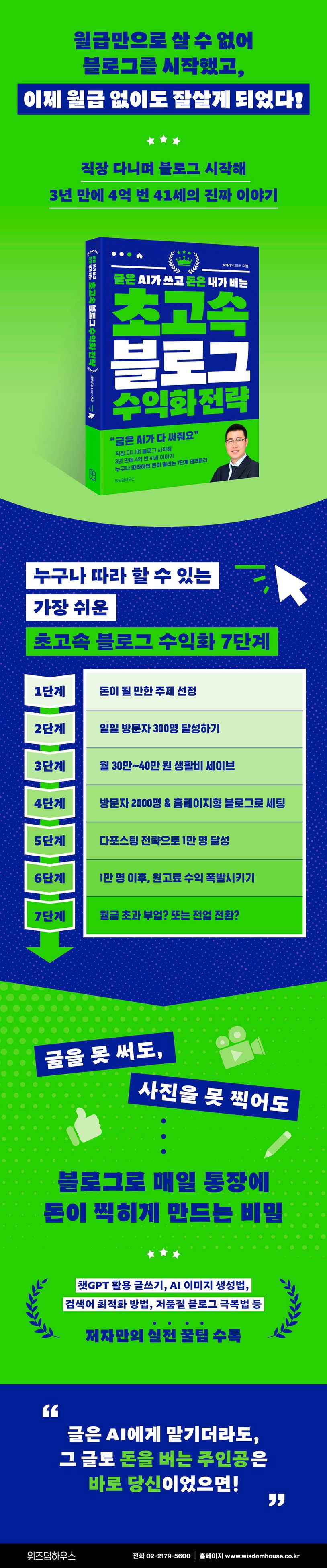 물가는 오르는데 월급은 물가 상승률을 따라가지 못해 늘 허덕이는 느낌이 들고, 희망퇴직을 받는 회사들이 늘어나는 걸 보면서 돈을 계속 벌 수 있을까를 고민하는 직장인들이 늘어나고 있다. 또한 경력 단절로 고민하는 주부나 용돈이 부족하지만 더 이상 부모님께 손 벌리기 힘든 학생들도 많다. 《글은 AI가 쓰고 돈은 내가 버는 초고속 블로그 수익화 전략》의 저자 새벽리더 역시 외벌이 아빠로 늘 추가로 돈 벌 방법을 고민해야 했다. 저자는 절박한 마음으로 블로그를 시작해, 새벽마다 출근 시간을 쪼개 키워드를 분석하며 꾸준히 글을 썼다. 그 결과 블로그만으로 월 1000만 원 이상의 수익을 달성했고, 3년 만에 4억이 넘는 성과를 얻을 수 있었다. 이 책은 41세 외벌이 가장의 절박함을 성장으로 바꾼 경험을 녹여낸, 누구나 따라할 수 있는 가장 쉬운 초고속 블로그 수익화 전략서다.