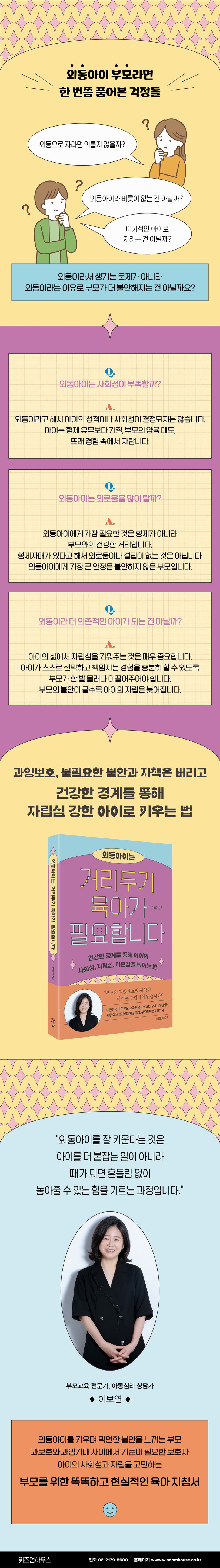 이 책은 ‘외동으로 자라면 외롭지 않을까’, ‘혼자 자라서 사회성이 부족하고 자기중심적인 아이가 되지는 않을까’와 같은 외동아이 부모의 불안을 점검하며, 부모가 아이를 어떻게 대해야 하는지 돌아보게 한다. 외동이라는 이유로 과잉보호와 자책에 빠지고 있지는 않은지, 부모 스스로의 양육 태도를 살펴보도록 돕는다. 외동 육아에 필요한 양육의 원칙부터 환경 조성, 부모의 마음챙김까지 외동아이를 키우는 부모에게 꼭 필요한 내용을 폭넓게 담아냈다. 부모교육 전문가 이보연 저자는 외동아이를 잘 키운다는 것이 아이를 더 붙잡는 일이 아니라, 때가 되면 흔들림 없이 놓아줄 수 있는 힘을 기르는 과정임을 강조한다. 외동아이를 키우며 막연한 불안을 느끼는 부모, 과보호와 과잉기대 사이에서 기준이 필요한 보호자, 외동아이의 사회성과 자립을 고민하는 부모에게 이 책은 저출산 시대 외동부모를 위한 현실적인 지침서가 될 것이다.