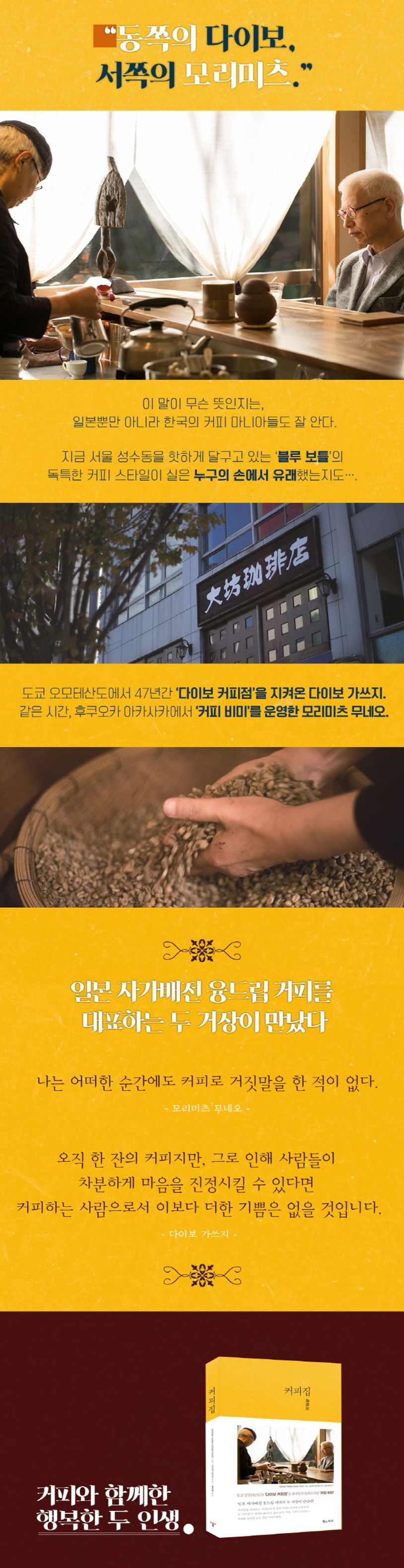 이 책 《커피집(원제: ??屋)》은 자가배전 융드립 커피의 두 장인, 다이보 가쓰지와 모리미츠 무네오가 만나 커피와 인생을 이야기한 대담집이다. 총 세 차례에 걸친 대담에는 커피콩을 바라보는 시선부터 각자 추구하는 커피 스타일, 음악, 미술, 그리고 한 잔의 음료를 매개로 만났던 손님들 등 커피를 내리는 일을 통해 완성해낸 두 ‘커피집’의 삶이 오래도록 잊히지 않을 흑백사진들처럼 녹아들었다.