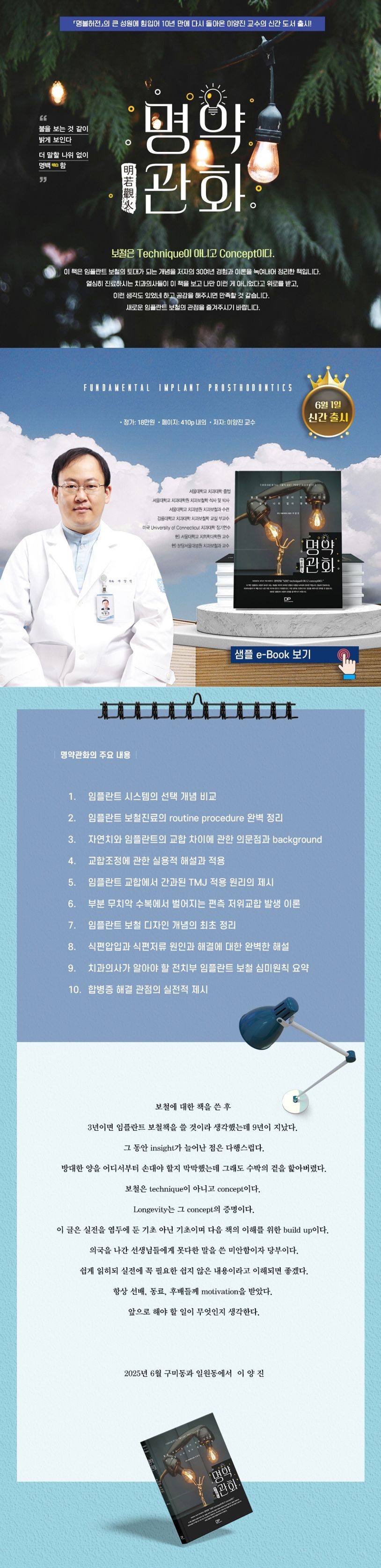 임플란트 보철 치료 시 합병증 예방을 위해 꼭 필요한 내용만 담았습니다. '명약관화’는 임플란트 합병증을 예방하기 위한 설계 디자인과 교합, 치간공극, 식편압입 등 민감한 고민들과 접근 방법을 이양진 교수님의 시선으로 제시합니다.